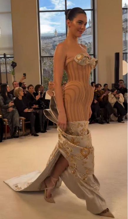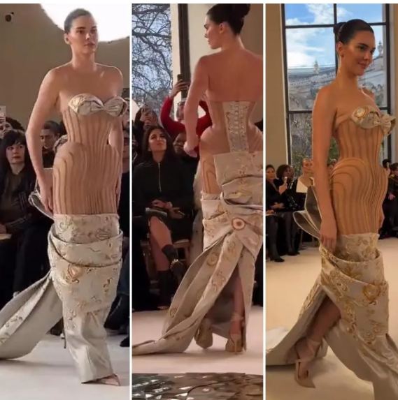 وبدت كيندال جينر بإطلالة بإطلالتها الفريدة والأنيقة، مستوحاه من وروح الدار، خارجة عن المألوف متناغمة من أجواء العرض، حيث ارتدت فستانًا طويلًا مجسمًا، منقسم الى عدة