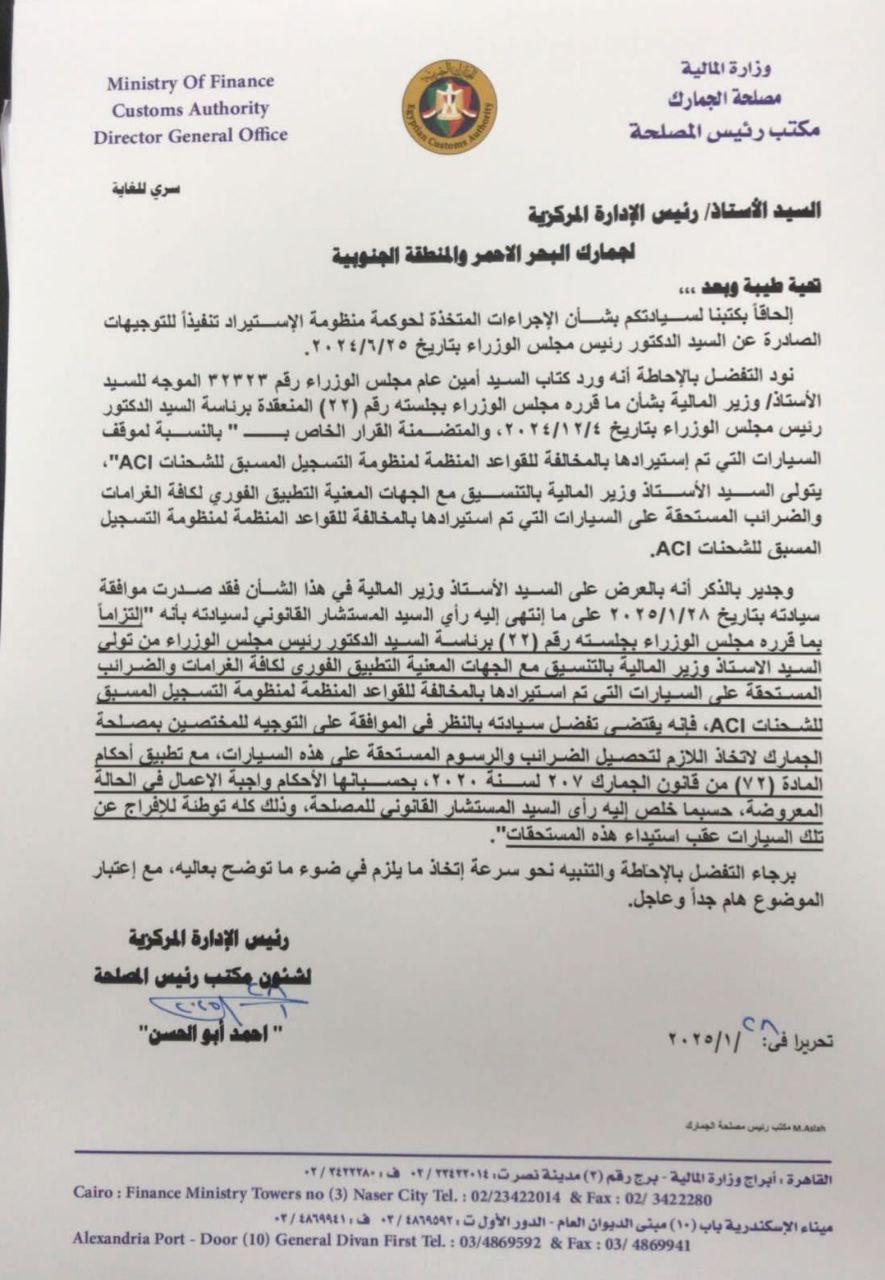 كانت "المالية" ممثلة في مصلحة الجمارك المصرية، قد أصدرت قراراً جديداً بشأن اتباع الإجراءات الخاصة باستيراد السيارات من الخارج، وذلك بالمنافذ الجمركية خاصة الموانئ المصرية، وحصلت الوفد على نسخة منه.