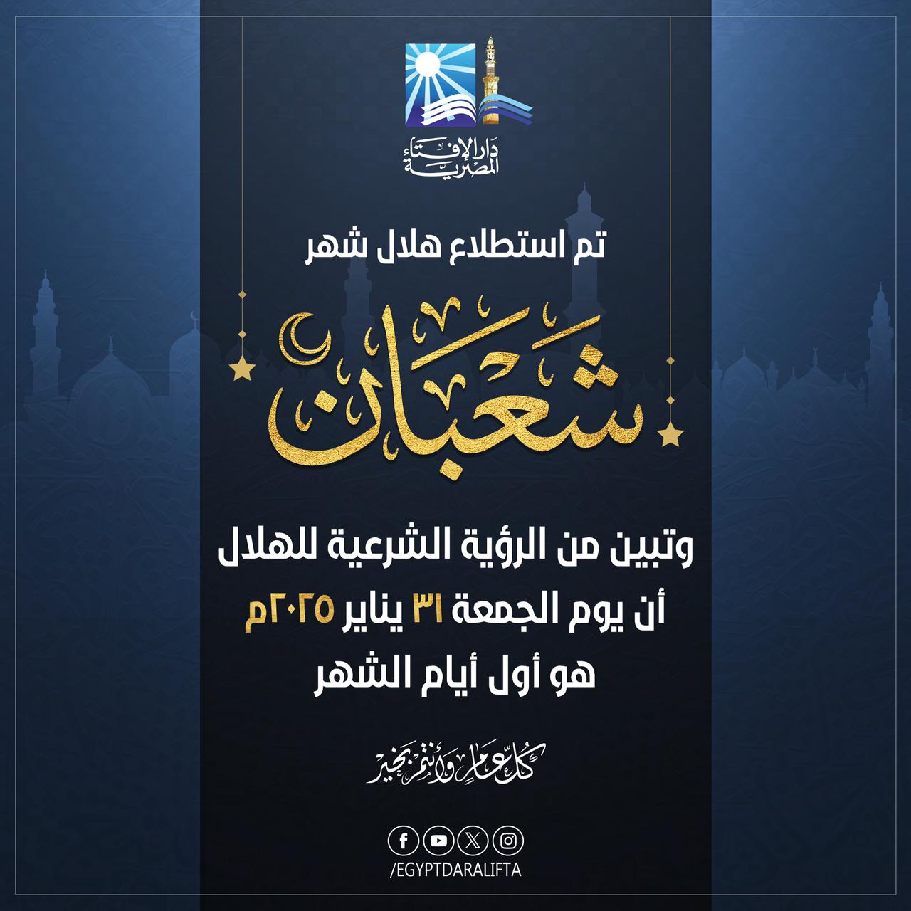 وعلى ذلك تُعلن دارُ الإفتاءِ المصريةُ أن يومَ الخميس الموافق الثلاثين من شهر يناير لعام ألفين وخمسة وعشرين ميلاديًّا هو المتمم لشهر رجب لعام ألف وأربعمائة وستة وأربعين هجريًّا، وأن يوم الجمعة الموافق الواحد والثلاثين من شهر يناير لعام ألفين وخمسة وعشرين ميلاديًّا هو أول أيام شهر شعبان لعام ألف وأربعمائة وستة وأربعين هجريًّا.
