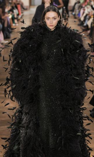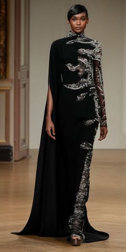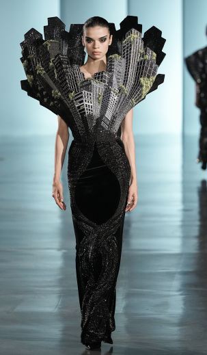 اكتسبت صناعة الهوت كوتور شهرتها من فساتين السهرة الأنيقة والكلاسيكية، ولكن خلال السنوات الماضية، تحديداً مع بداية الألفية الثالثة، شهدت صناعة الموضة الأبرز تحولاً جذرياً، فأصبحت القصات الغريبة والسريالية هي النغمة السائدة، فكلما كان التصميم غريباً سيضمن بذلك أن يجذب الأنظار ويحدث الجدل بين صفوف حضور عروض أسبوع باريس، لتصبح التصاميم الدراماتيكية واقعًا لا يمكن تجاهلها، فقد أطلت عارضات راهول ميشرا Rahul Mishraبتشكيلة من الفساتين غير التقليدية والتي أعجبنا منها الفستان المخمل الأسود المصمم بتوب مستوحى من العمارة الهندسية ومميز بقصته المعانقة للقوام.