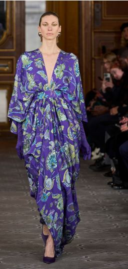 بخلاف لوحة الألوان المرتكزة على النغمات الترابية والباستيلية، اعتمدت بعض الدور العالمية على الألوان الحيوية كركيزة أساسية صاغت بها أجمل التصاميم، فأخذنا عرض إيمان أيسي Imane Ayissiفي نزهة وسط الحدائق الغناء حيث تمايلت العارضات بباقة من الفساتين الملونة ذات القصات الأنثوية الآسرة وقد زين معظمها بأنماط الورود الملونة لتبطل سحر الفساتين المطرزة والتي تفضلها النساء العاشقات للإطلالات الثرية، سيعجبك مثلنا الفستان الأرجواني المصمم بقصة واسعة والذي حدد خصره بحزام عريض استقر أسفل الصدر مباشرة ليتيح لباقي التصميم أن يخفي المناطق الممتلئة من الجسم.