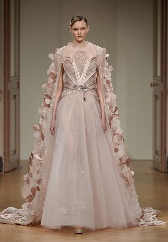 وسيطرت صيحة الفساتين المزودة بالكابات الطويلة دور الأزياء في أسبوع باريس للهوت كوتور التى يزين أغلبها بالتفاصيل البارزة مثل الورود والريش النافر.