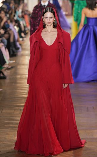ومن نفس المجوعة لافت إنتباهنا الفساتين الموصولة بأغطية الرأس لتعود بقوة في ربيع وصيف 2025؛ لكى تصبح الخيار الأمثل أمام محبات الموضة، وخطف قلوب الجميع الفستان الأحمر المصمم بياقة V Neck وخصر على شكل الكوسيه والذي ارتدت فوقه العارضة معطفاً طويلاً مع غطاء رأس من اللون نفسه، تصميماً فريداً نتوقع أن نراه على السجادة الحمراء لأحد المهرجانات الفنية قريبًا.