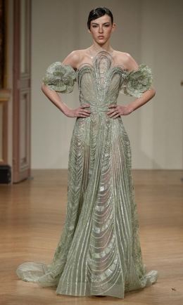 وسجلت تصاميم فساتين الأكمام المنفصلة حضورًا قويًا على منصات دور الأزياء في أسبوع الموضة بباريس لعام 2025 لتظل من أبرز الصيحات المحببه من العام الماضي، وتفنن المصمم زياد نكد في تقديم قطع ساحرة خطفت أنظار حضور عرضه الذي امتار بالفخامة والنعومة، حيث ارتكزت لوحة الألوان لديه على النغمات الباستيلية الحالمة والقصات المنسدلة على أجسام العارضات في نعومة مدموجة بدقة التطريز، وكانت الورود التفصيلة الغالبة على عرضه، فصممت ياقات الفساتين على شكل البتلات البارزة، والأكمام كانت على هيئة ورود كبيرة منفصلة عن الفستان، الموديل الذي تميز بلونه الأخضر النعناعي ازدان بتطريز من اللون نفسه، وجاء بذيل قصير ستحبه عاشقات الإطلالات الدراماتيكية.