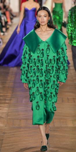 فرأينا الفساتين المستوحاة من قطع نعتمدها في أزيائنا اليومية وهي تملأ مدارج العروض، وعلى رأسها الفساتين المستوحاة من المعاطف خاصة تلك المزودة بأزرار على الجانبين Double Breasted أو المصممة يباقات عريضة، فوقعنا في عشق الفستان الساتان الأخضر المميز بياقته العريضة والمزين بالشرائط المثبتة بتطريزات على شكل ورود صغيرة من عرض المصمم جورج حبيقة Georges Hobeika.