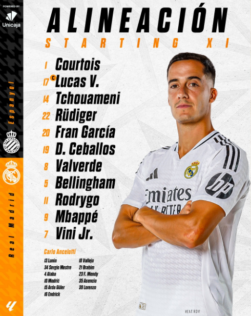 أعلن كارلو أنشيلوتي المدير الفني لـ ريال مدريد تشكيل فريقه لمواجهة نظيره إسبانيول اليوم السبت على ملعب آر سي دي إي، ضمن منافسات الجولة الثانية والعشرين من الدوري الإسباني.