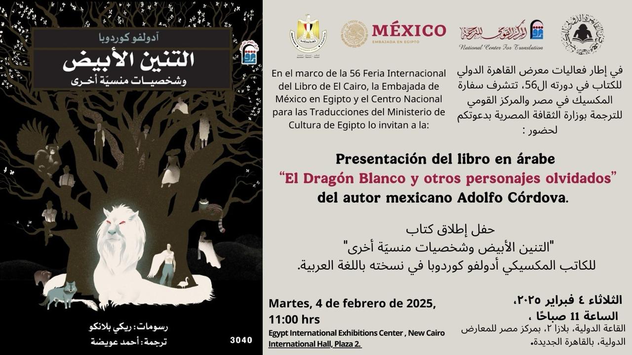 ينظم المركز القومي للترجمة برئاسة الأستاذة الدكتورة كرمة سامي غدًا ندوة مناقشة كتاب "التنين الأبيض وشخصيات منسيّة أخرى" تأليف آدولفو كوردوبا بالتعاون مع سفارة المكسيك وبحضور مترجمه الدكتور أحمد عويضة وسفيرة المكسيك Leonora Rueda وEduardo Fragoso Salomon وHector Ortega Nieto، وذلك في تمام الساعة الحادية عشرة من صباح غد الثلاثاء الموافق ٤ فبراير بالقاعة الدولية بمعرض القاهرة الدولي للكتاب في دورته السادسة والخمسين.