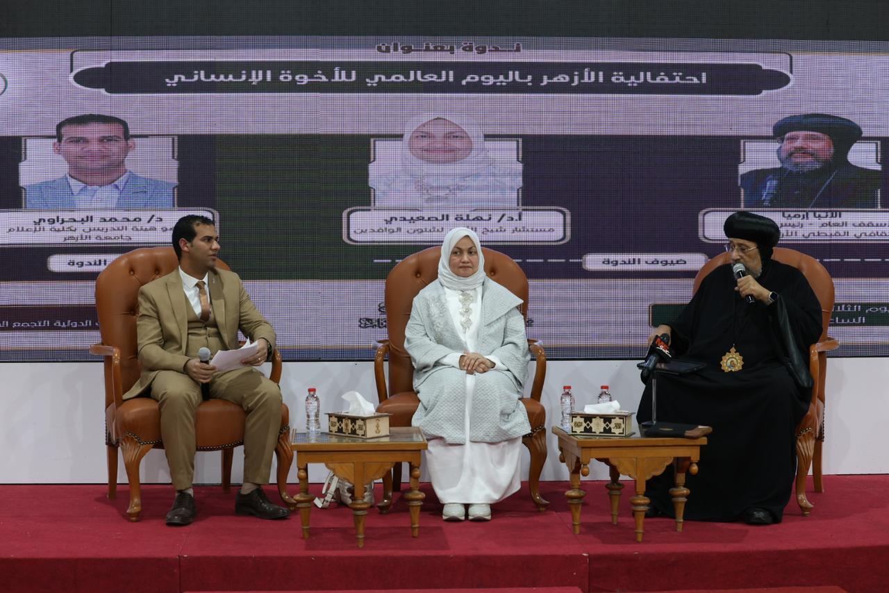 وأشارت الصعيدي إلى أن وثيقة الأخوة الإنسانية التي وقعها فضيلة الإمام الأكبر مع بابا الفاتيكان تعتبر تطبيقًا عمليًا لتعاليم الدين الإسلامي، وتلخيصًا مهمًا لما جاءت به كل الأديان السماوية حيث جاءت كافية وشافية وشاملة لكل الفئات والأطياف والأديان، حيث أكدت على ضرورة التعايش السلمي واحترام الآخر، واهتمت بالمرأة وأهمية تكريمها، وجعلت العمل الصالح هو أساس التكريم وليس اللون أو النوع، وبيَّنت الصعيدي أن المبادئ والقيم التي جاءت بها وثيقة الأخوة الإنسانية دعت إلى نبذ الكراهية والعنف، والعمل من أجل السلام العالمي، كما شجعت على التفاهم والاحترام والفهم المتبادل بين جميع الناس بغض النظر عن معتقداتهم أو ثقافاتهم. وعن دور الأزهر ورسالته، أكدت الصعيدي أنها رسالة عالمية منبثقة من رسالة الإسلام وهدي نبيه الذي دعا للسلام والتسامح، حيث عقد الأزهر الشريف ملتقى الأخوة الإنسانية وملتقى الطلاب الوافدين للتأكيد على أهمية لغة الحوار وتعزيز قيم فهم الآخر، كما عززت مناهج الأزهر من القيم الإنسانية الراقية، ولقد خلق الله الناس جميعا من نفس واحدة على اختلاف لغاتهم وثقافاتهم المختلفة، تربطهم صلة واحدة هي صلة الأخوة والإنسانية.
