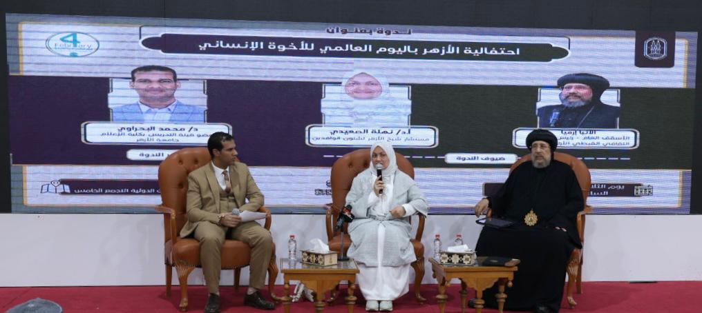 نظم جناح الأزهر الشريف بمعرض القاهرة الدولي للكتاب في دورته السادسة والخمسين، اليوم الثلاثاء، ندوة بعنوان " احتفالية الأزهر باليوم العالمي للأخوة الإنسانية"، شاركت فيها الدكتورة نهلة الصعيدي، رئيس مركز تعليم الطلاب الوافدين، ومستشار شيخ الأزهر لشئون الوافدين،الأنبا إرميا، الأسقف العام ورئيس المركز الثقافي القبطي الأرثوذكسي، وأدار الندوة الدكتور محمد البحراوي أستاذ الصحافة بإعلام الأزهر.