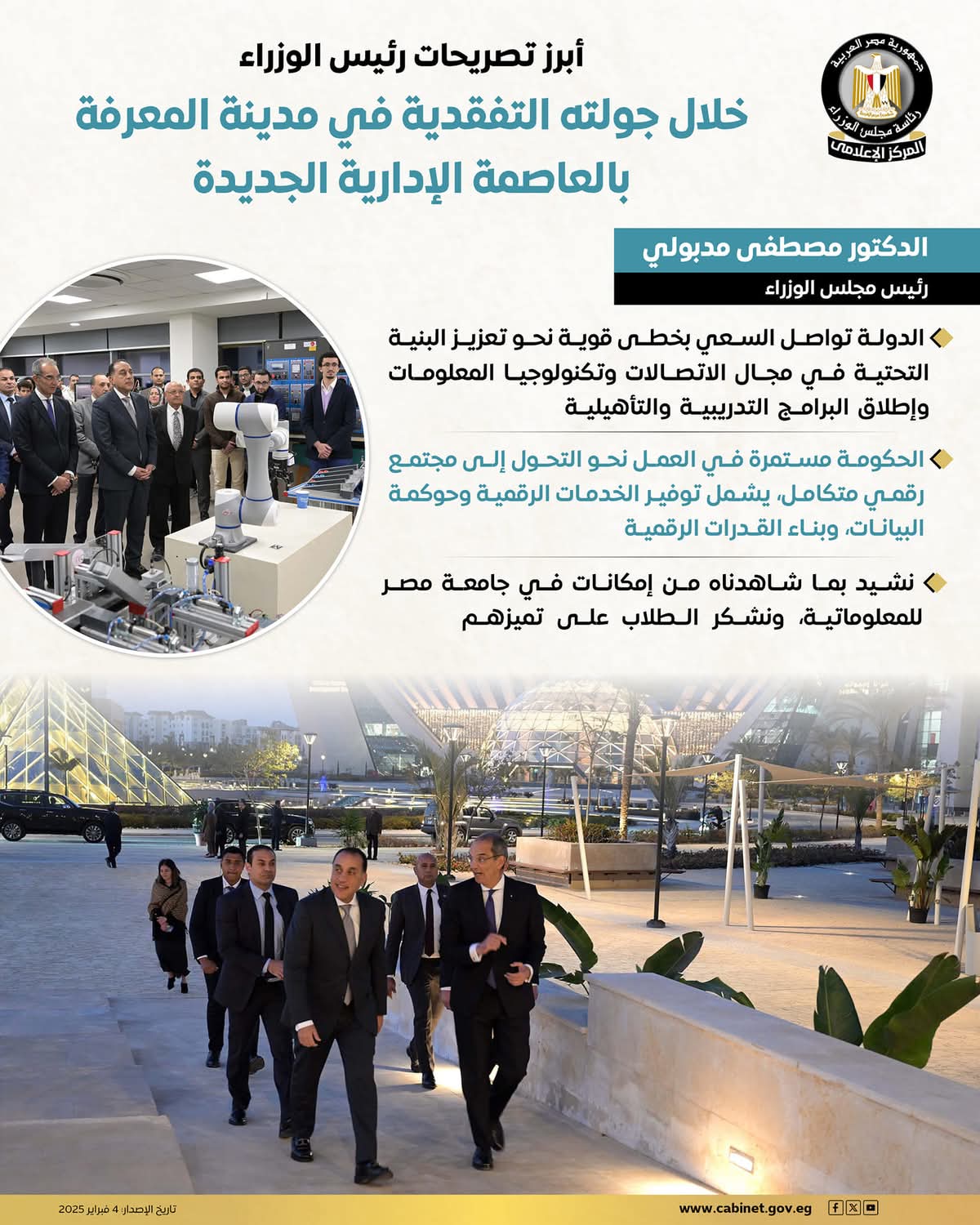 أبرز تصريحات رئيس الوزراء خلال جولته في مدينة المعرفة بالعاصمة الإدارية الجديدة