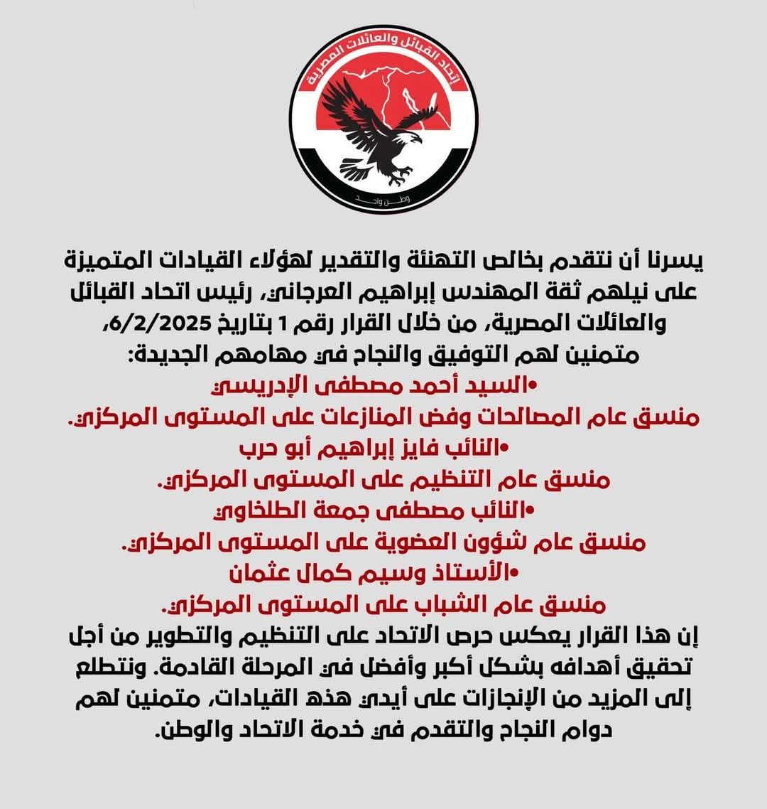وتقدم الكاتب الصحفي وسيم كمال عثمان امين شباب اتحاد القبائل العربية بخالص شكره للمهندس ابراهيم العرجاني علي ثقته الغالية و تقدم بالشكر للنائب احمد رسلان والنائب فايز ابوحرب علي دعمهما للشباب