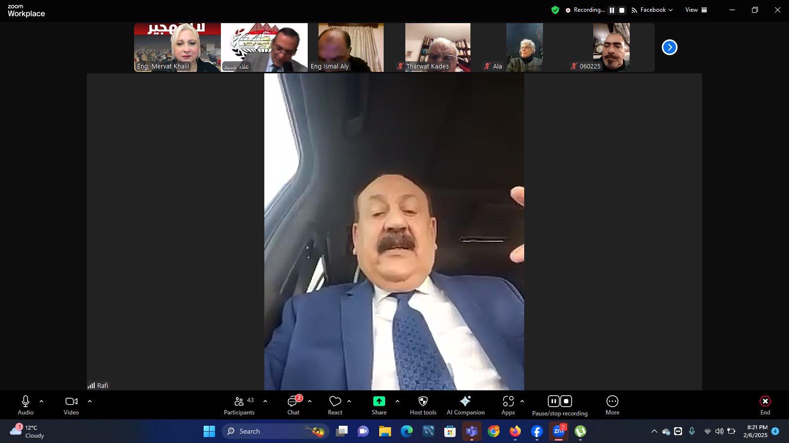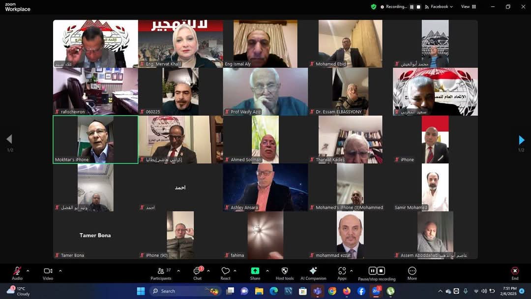 عقد أعضاء مجالس إدارة فروع الاتحاد العام للمصريين في الخارج اجتماعًا موسعًا عبر تقنية الزوم، مساء الخميس 6 فبراير 2025، لمناقشة تصريحات الرئيس الأمريكي دونالد ترامب حول تهجير الفلسطينيين من قطاع غزة، والتي أدلى بها خلال اجتماعه برئيس الوزراء الإسرائيلي في واشنطن يوم 4 فبراير الجاري.