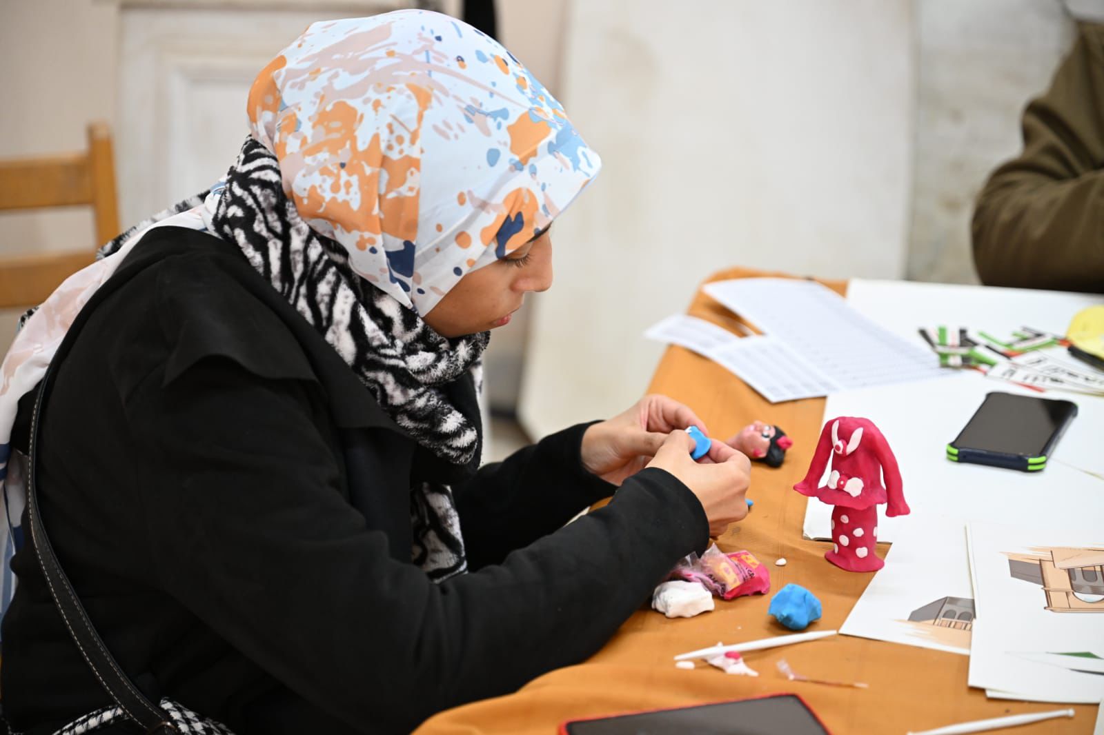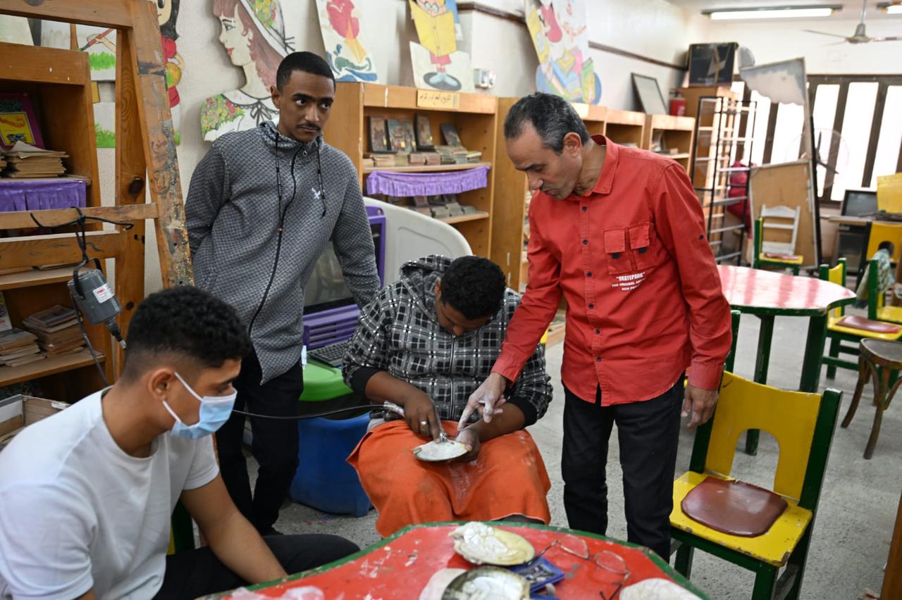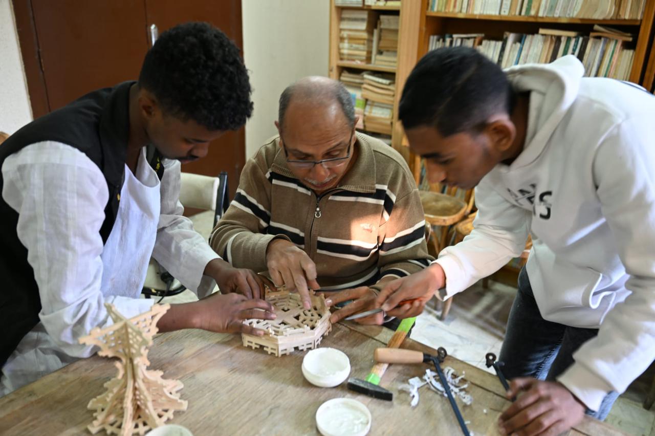 واصل المدرب أيمن السعدني تعليم المشاركين فن الأركت، الذي يعد من أجمل الفنون القديمة، ويعتمد على تفريغ الخشب وفق أشكال ورسومات محددة لإنتاج قطع فنية مميزة.