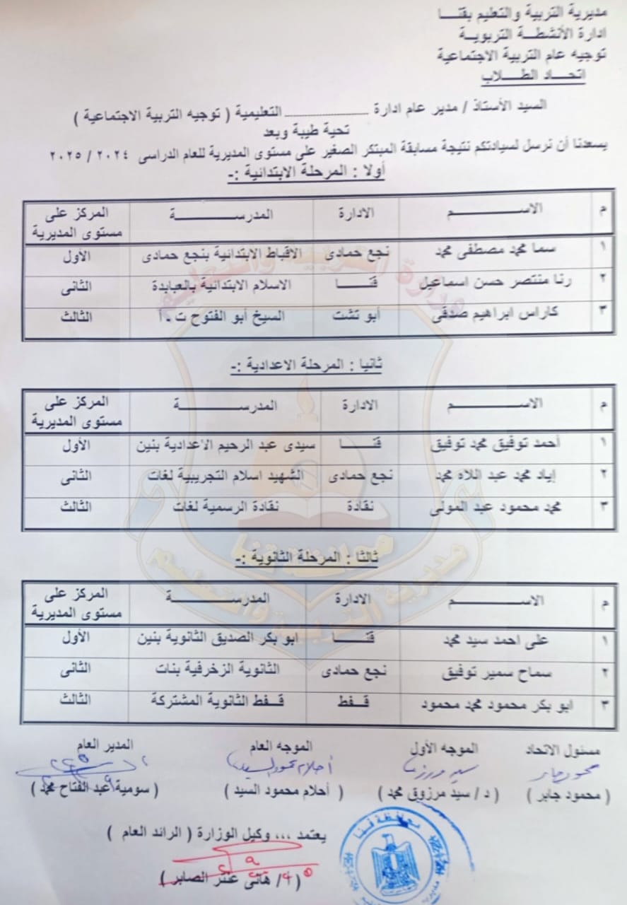 أعلنت مديرية التربية والتعليم بقنا، أسماء الطلاب الفائزين في مسابقة المبتكر الصغير على مستوى المديرية والتي نفذت وفق خطة توجيه عام التربية الاجتماعية تحت إشراف إدارة الأنشطة التربوية ، وجاءت نتيجة المبتكر الصغير للمرحلة الابتدائية بفوز سما محمد (نجع حمادي) بالمركز الأول، و رنا منتصر ( قنا ) في المركز الثاني و كاراس ابراهيم ( ابوتشت ) في المركز الثالث  .