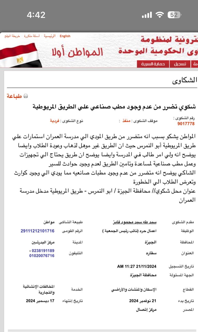 والشكاوى الـ 150 في حقيقتها كانت صرخات من أباء وأمهات حوالي ألف طفل ، ويقولون فيها " انقذوا أرواح أبناء التلاميذ بمجمع مدارس العمران سمارت الكائنه في المريوطيه التابعه لمركز ابو النمرس بالجيزة، فجميع تلاميذ المجمع مهددون بالموت تحت عجلات السيارات التي تسير بسرعات جنونية على طريق المريوطية- سقارة ، وهو الطريق الذي يمر أمام مجمع المدارس مباشرة ويشهد حوادث مرورية يوميا تقريبا".. وكل ما طلبه مقدمو الشكوى هو عمل مطب صناعي أمام المدرسة لكي يجبر قائدي السيارات من تهدئة سرعاتهم أثناء مرورهم أمام مجمع المدارس، وهو مطلب يسيط جدا ، و طبيعي جدا جدا