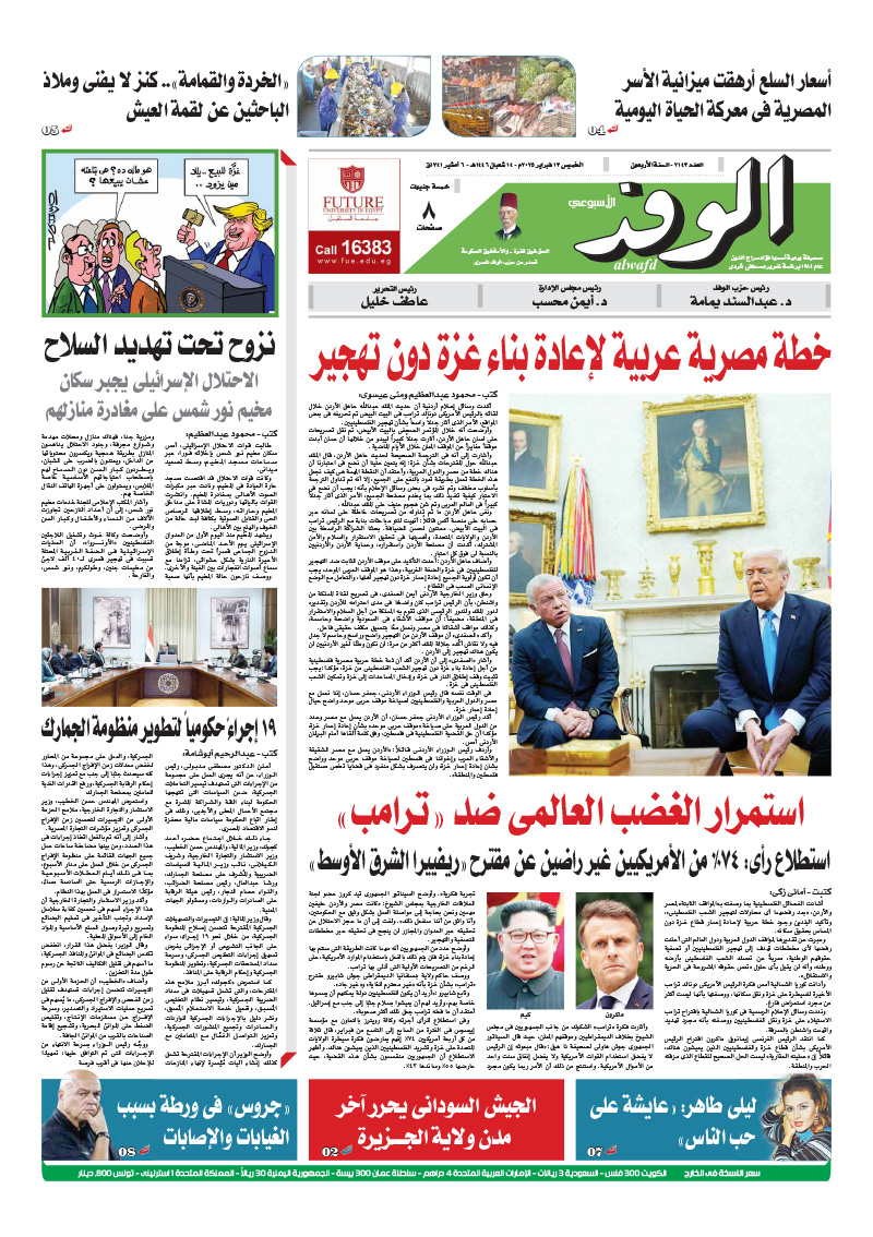 تنشر جريدة الوفد في عددها الصادر، غدًا الخميس، العديد من الموضوعات والتقارير الإخبارية المهمة، أبرزها: "خطة مصرية عربية لإعادة بناء غزة دون تهجير".