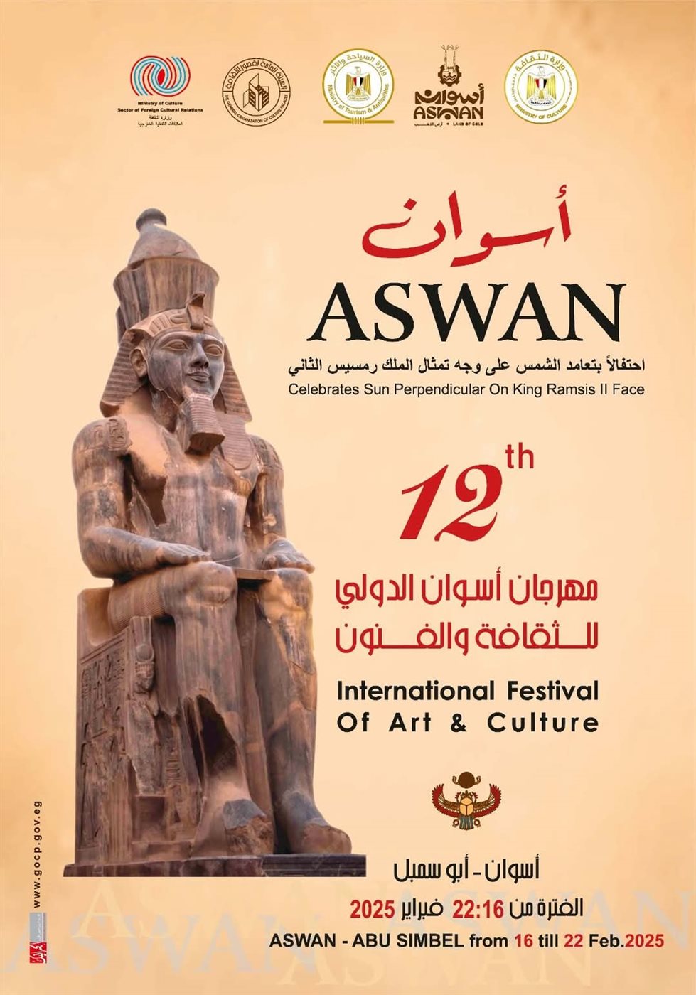 بين أحضان النيل الخالد وسماء الجنوب الصافية، تطلق وزارة الثقافة، صباح بعد غد الأحد فعاليات مهرجان أسوان الدولي للثقافة والفنون في دورته الثانية عشرة، لتتحول المدينة العريقة إلى مسرح عالمى ينبض بالفن والإبداع، وذلك تحت رعاية الدكتور أحمد فؤاد هنو، وزير الثقافة، واللواء إسماعيل كمال، محافظ أسوان.