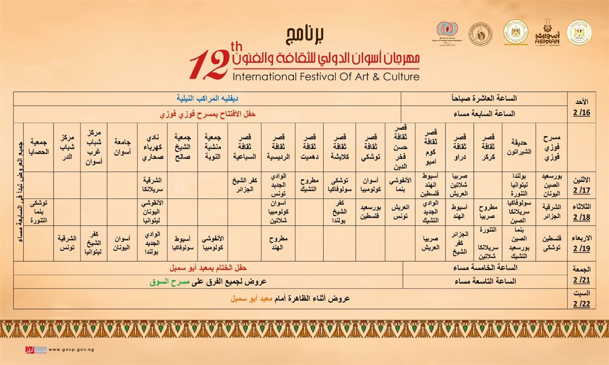 برنامج فعاليات مهرجان أسوان الدولي للثقافة والفنون في دورته الثانية عشرة