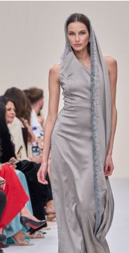 تصدرت موضة فساتين غطاء الرأس دور الأزياء العالمية وهذا ما قدمته دار مانيل Manel  من خلال تصميم الفستان الفضي الغريج المزود بغطاء للرأس وهو يتسم بتصميم مستقيم ويوحي بالغموض والجاذبية.