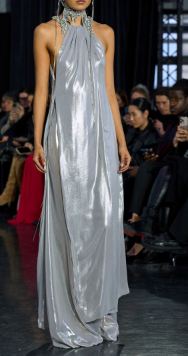 ابتكر المصمم كريستيان سيريانو Cristian Siriano الفستان اللاميه الرصاصي المتموج بطابع هولوغرام ويتسم بياقة معقودة عند العنق ويتسم بأكتاف منسدلة وينحدر نحو الأسفل بقصة ضيقة ومستقيمة، وهو مناسب لذوات البشرة الفاتحة والشعر الأشقر، لأنه يبرز بانعكاساته اللونية جاذبية الشقراوات.