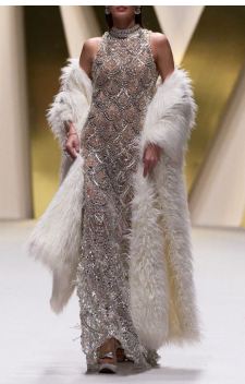 نفذ المصمم المبدع مانيش مالهوترا Manish Malhotra فستاناً راقياً من مجموعة خريف وشتاء 2025- 2026، الفستان المطرز بأحجار براقة وخيوط فضية على قاعدة من التول الشفاف القاسي، وتم تنسيقه بعناية مع مشلح من الفرو الطويل.