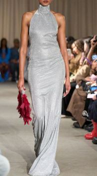 إبدعت دار تيا أديولا Tia Adeola في تصميم الفستان الفضي لشتاء 2025، واتسم الفستان الفضي الغليتر بياقة Halter Neck يتمتع بقصة ضيقة منسدلة تلتف حول القوام ويمكن تنسيقها مع حقيبة كلاتش بلون أحمر مزدانة بالريش لمزيد من الإبهار.