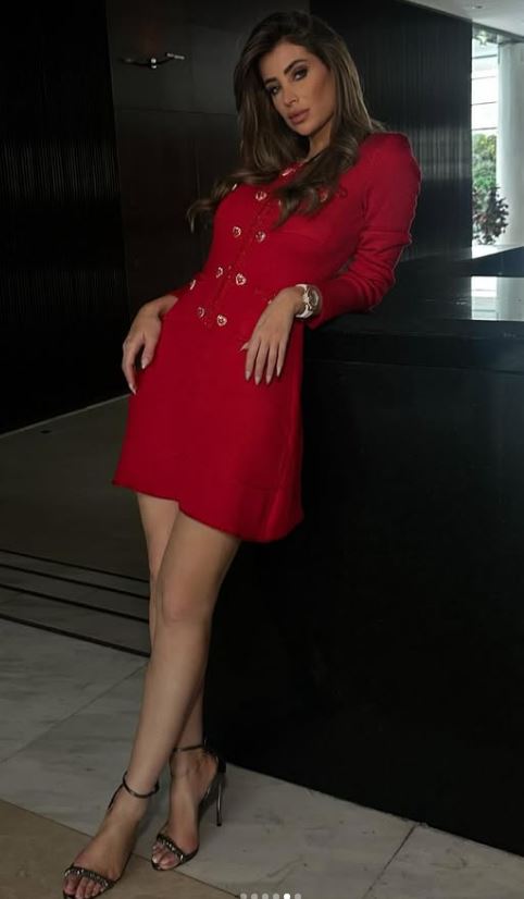 وبدت أنابيلا هلال بإطلالة ساحرة، حيث ارتدت فستانًا طويلًا مجسمًا، بأكمام طويلة صمم من قماش فاخر باللون الأحمر الداكن وزين بالأزرار الذهبية من الأمام، فيما انتعلت صندلًا بكعب عالٍ.