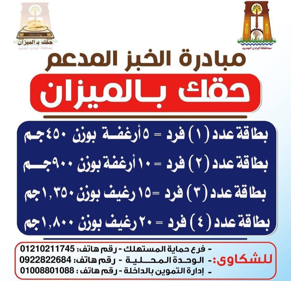 أعلن اللواء محمد الزملوط محافظ الوادي الجديد، بدء تطبيق مبادرة (حقّك بالميزان) التي أطلقتها المحافظة للقضاء على مشكلة تفاوت الأوزان في رغيف الخبز المدعم.
