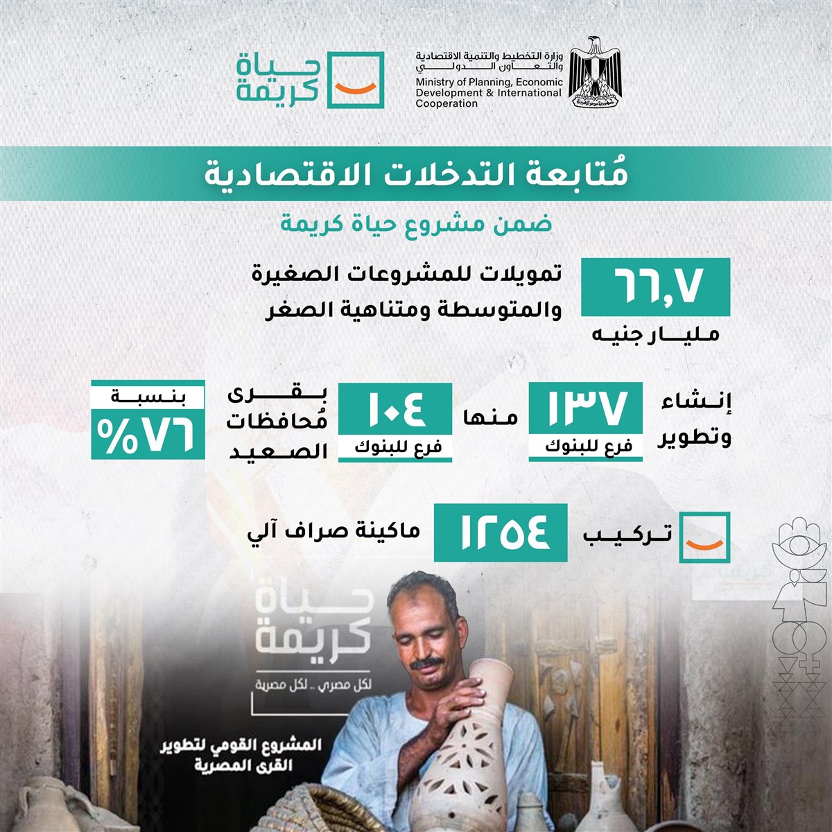 من حيث مُتابعة التدخلات الاقتصادية ضمن مبادرة "حياة كريمة"، فقد تم إتاحة التمويل للمشروعات الصغيرة والمتوسطة ومتناهية الصغر بقيمة 66.7 مليار جنيه، كما تم إنشاء وتطوير 137 فرع للبنوك، منها 104 فرع بقرى مُحافظات الصعيد بنسبة 76%، إلى جانب تركيب 1254 ماكينة صراف آلي بقرى المرحلة الأولى، منها 948 ماكينة بقرى مُحافظات الصعيد بنسبة 76%، وهو ما نتج عنه تغطية كافة الوحدات المحلية بنسبة 100% بماكينات الصرف الآلي، ضمن الجهود المبذولة للتوسع في الشمول المالي. كما تحسن مؤشر الشمول المالي بـــ ـ16.2 نقطة مئوية في قرى "حياة كريمة".