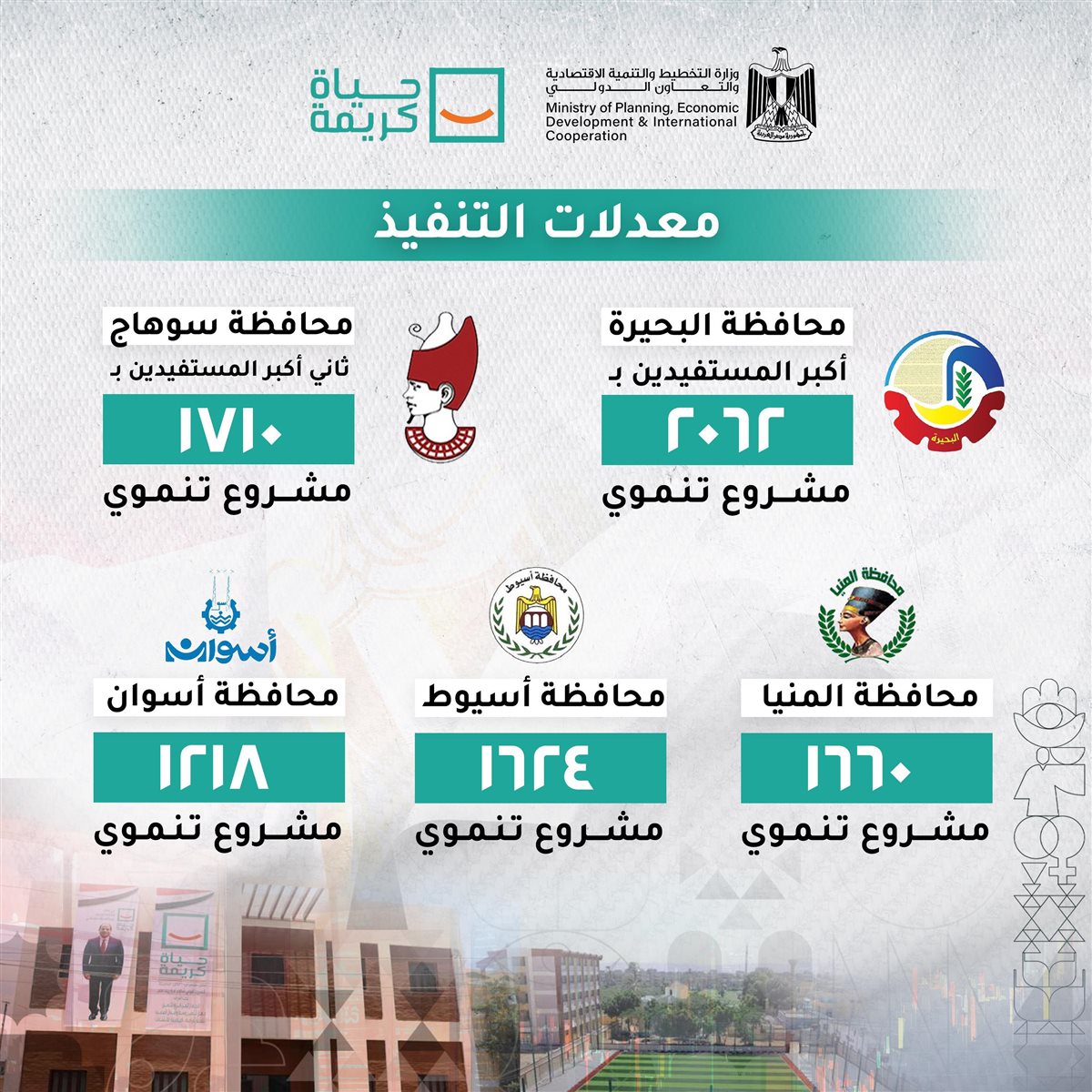 وجاءت محافظة البحيرة في مقدمة المحافظات من حيث عدد المشروعات المنتهية بعدد 2062 مشروعًا، تليها محافظة سوهاج بعدد 1710 مشروعات، ثم محافظة المنيا بعدد 1660 مشروعًا، وأسيوط 1624 مشروعًا، وأسوان 1218 مشروعًا.
