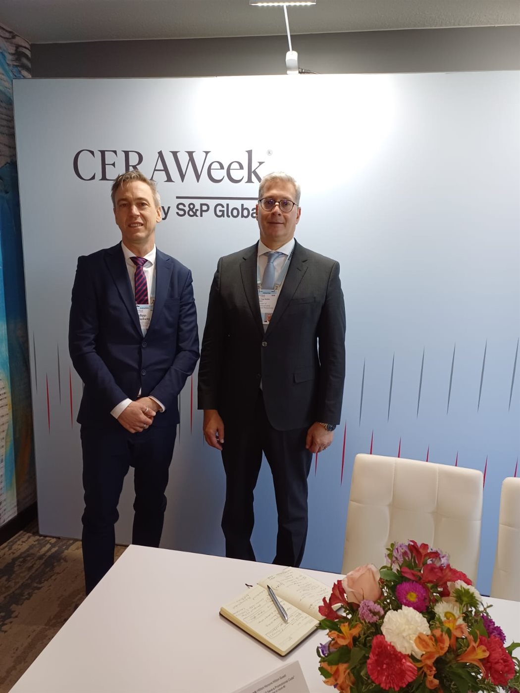 على هامش مشاركته في أسبوع سيراويك 2025 الذي يتم عقده خلال الفترة من 10 – 14 مارس 2025 بمدينة هيوستن بولاية تكساس الأمريكية، عقد المهندس كريم بدوي، وزير البترول والثروة المعدنية جلسة مباحثات مع فيليب شتاينبرغ - المدير العام لتحقيق الاستقرار الاقتصادي وأمن الطاقة والبنية التحتية للغاز والهيدروجين - بوزارة الشئون الاقتصادية والعمل المناخي الألمانية بحضور دكتور جيولوجي سمير رسلان وكيل الوزارة للاستكشاف والاتفاقيات.