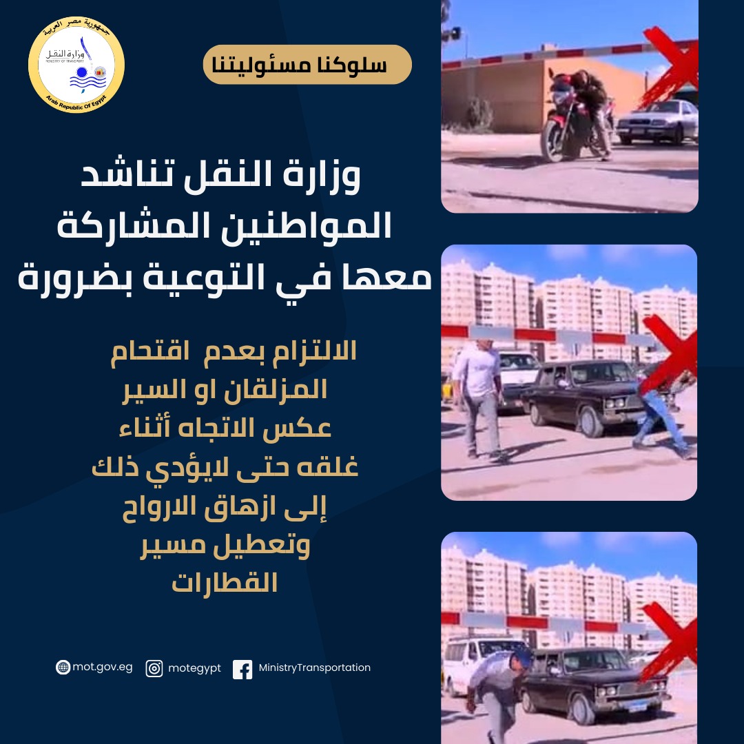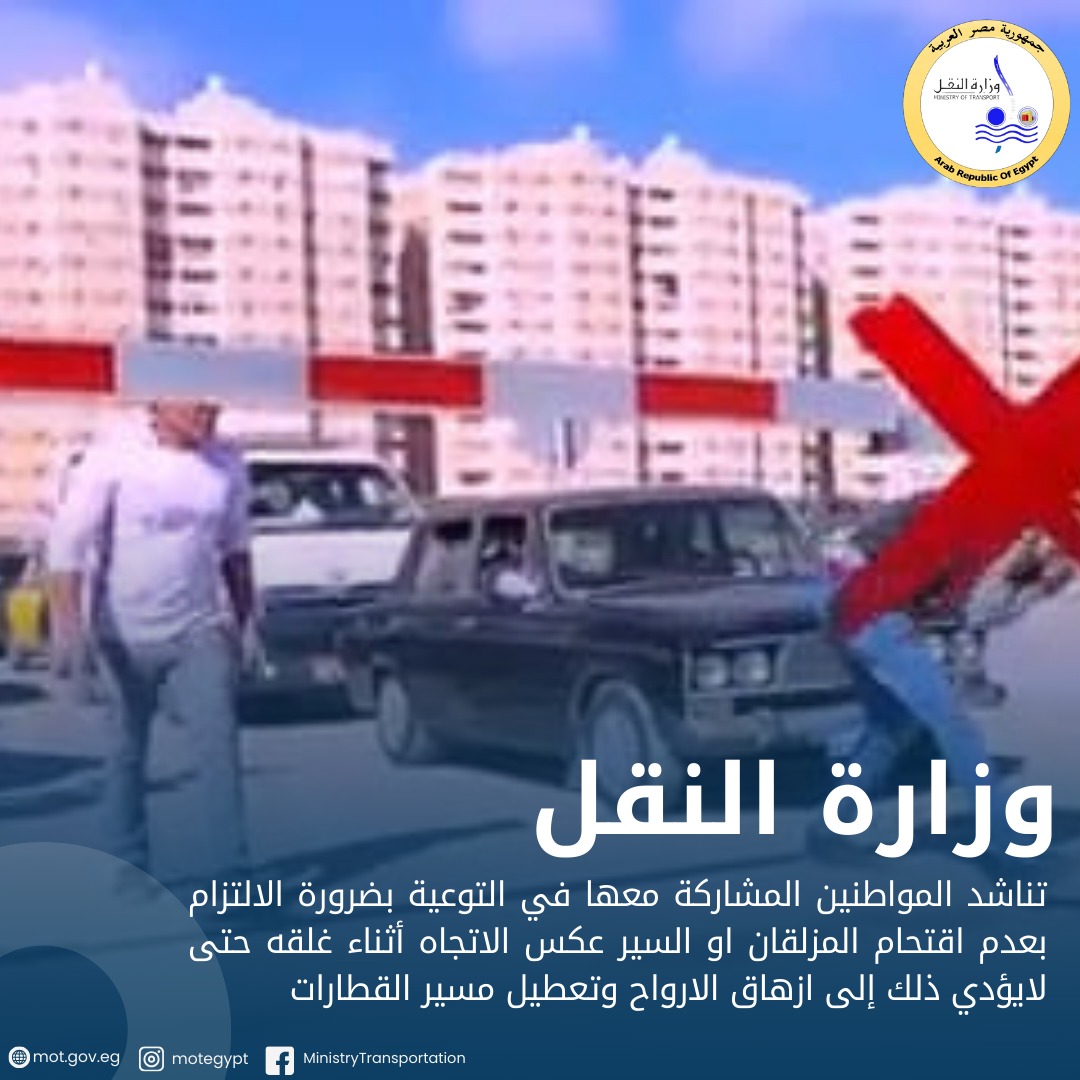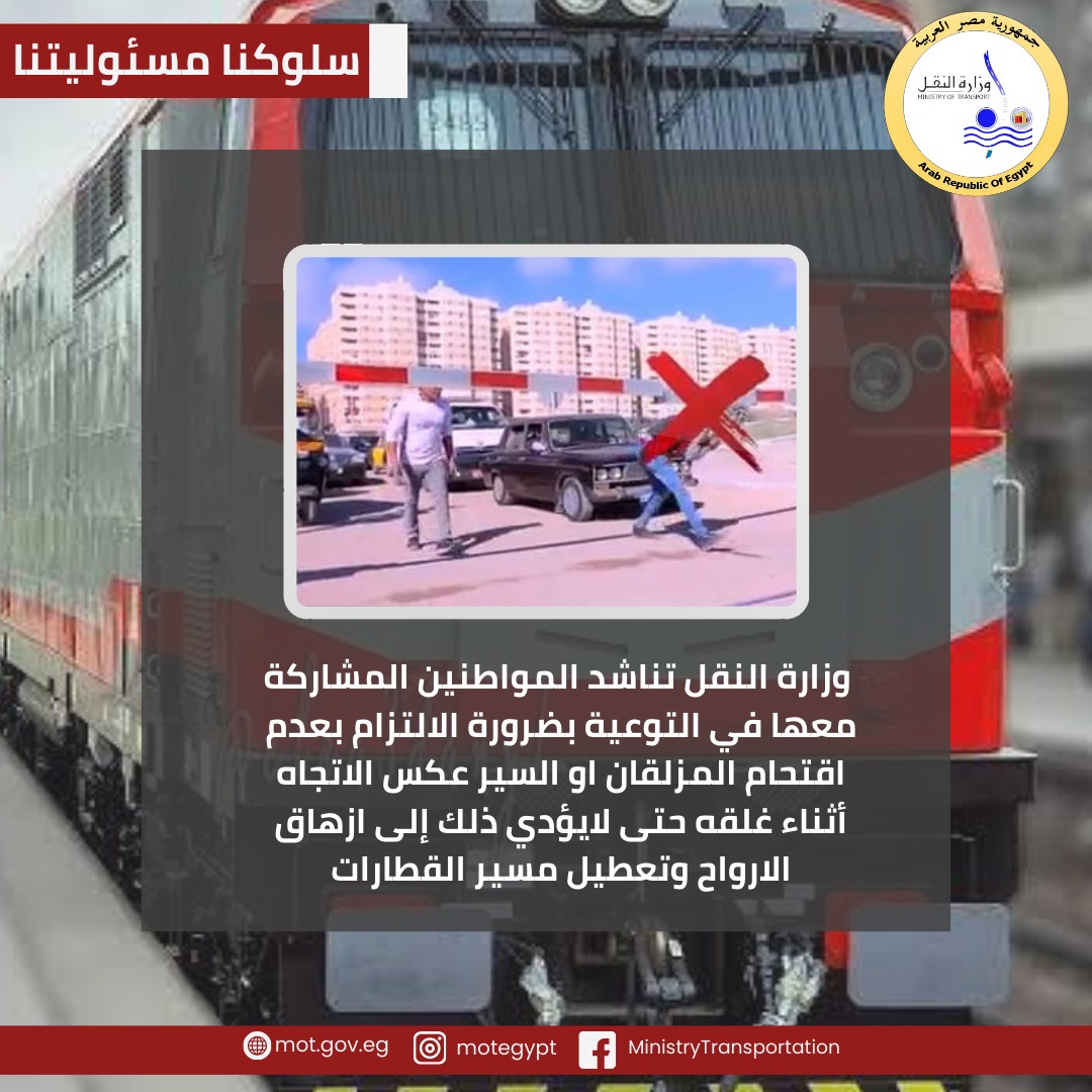 ناشدت وزارة النقل السادة المواطنين بضرورة توخي الحذر عند عبور مزلقانات السكة الحديد والالتزام بتعليمات هيئة السكك الحديدية عند العبور و الالتزام بالعبور بعد فتح المزلقان ومرور القطار وعدم اقتحام المزلقان او السير عكس الاتجاه أثناء غلقه حتى لايؤدي ذلك إلى ازهاق الارواح وتعطيل مسير القطارات.