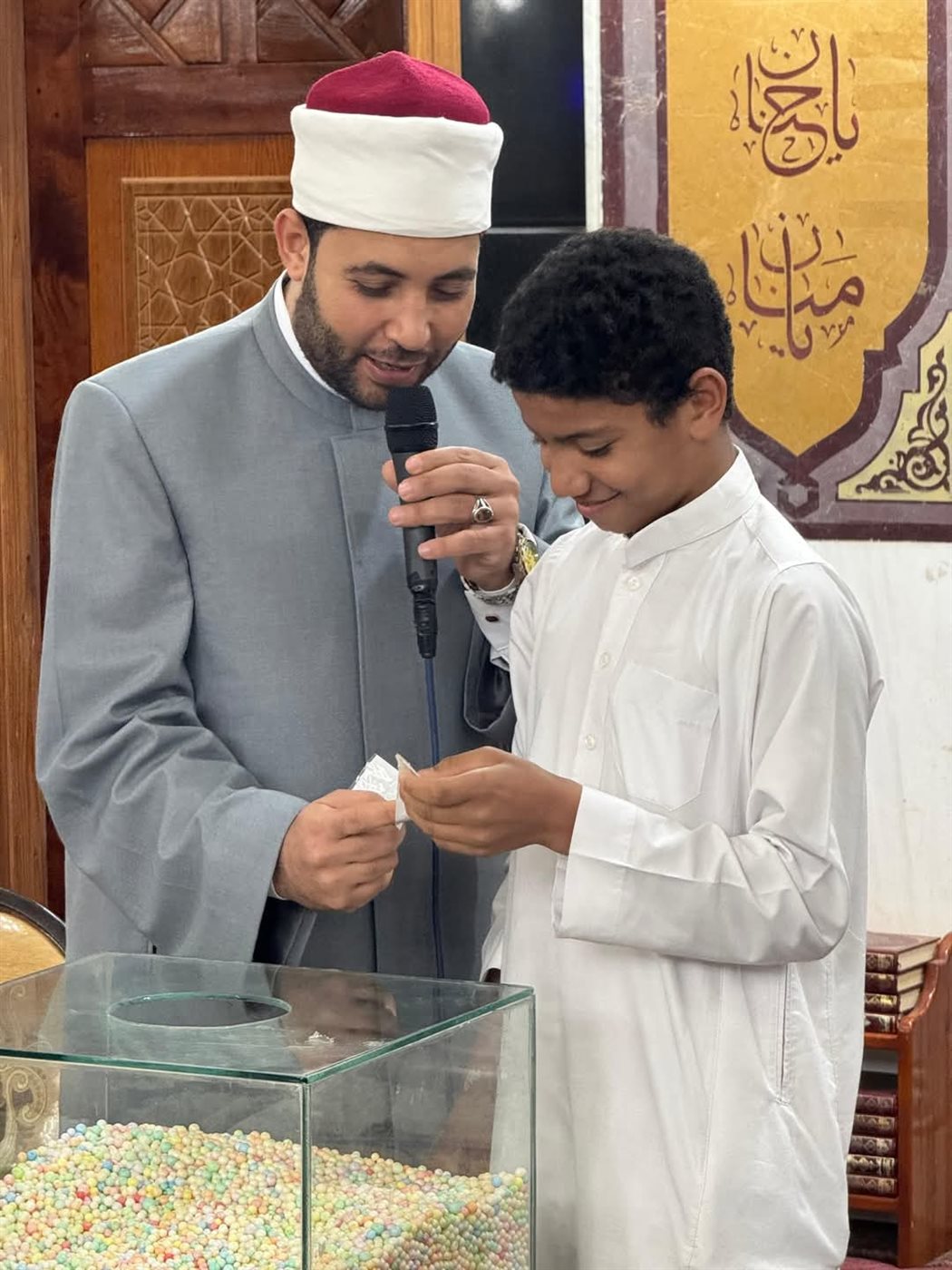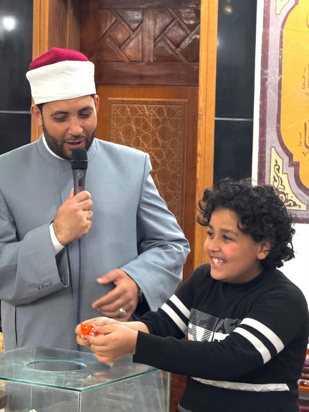 كما اضاف محمود أن الأطفال مقدمى الخطابة والقرآن والانشاد تم تقديم هدايا لهم من صندوق المفاجأت التابع للمسجد بالإضافة إلى مكافأة مالية من احد رواد المسجد