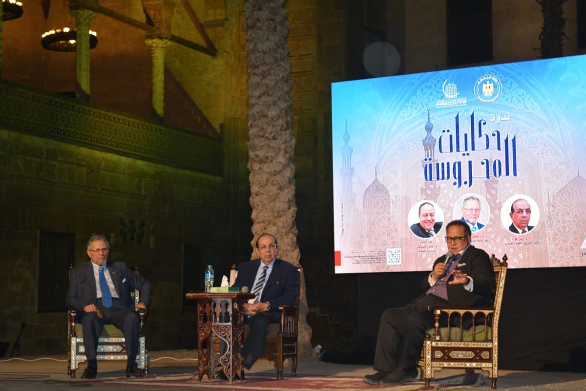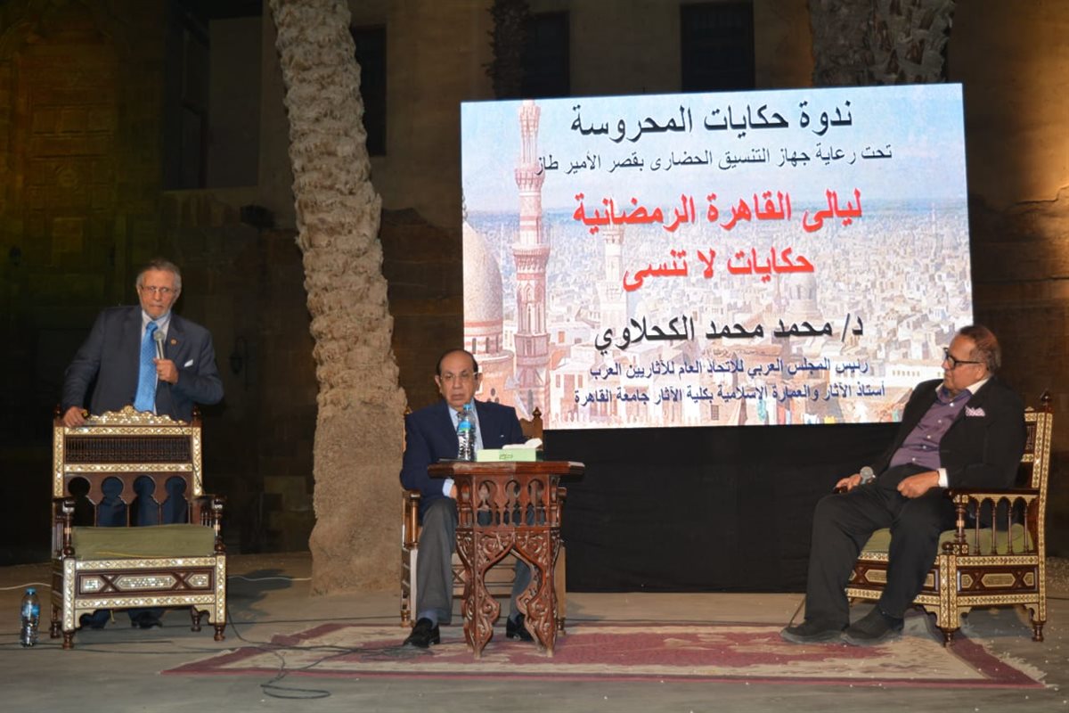 و تحدث فيها د. محمد الكحلاوي رئيس اتحاد الآثاريين العرب وأستاذ التاريخ والآثار الإسلامية ، الذي تحدث عن الليالي الرمضانية في حكايات المحروسة ومظاهر الاحتفال بالشهر الكريم الذي ترسخت في عصر الدولة الفاطمية بدءا من العمارة الفاطمية التي تبدأ بسور القاهرة الشمالي وباب الفتوح وباب زويلة ومنطقة بين القصرين بالمعز التي تبدأ منها الاحتفالات بحلول الشهر المعظم بعد ثبوت الهلال وتبشير الخليفة بنتيجة الرؤية وتوزيعه المنح والعطايا للرعايا وتدق طبول المسحراتي لكل منطقة وإعلان الصيام فكل مظاهر الاحتفالات الرمضانية كانت من نتاج الدولة الفاطمية بطقوسها التي مازالت حكايتها المحروسة نحتفل بها حتى الآن، وعرض لاحتفالات خروج كسوة الكعبة من القلعة في أول يوم شوال على خمس حوامل حتى تلحق الحج بمباركة الخليفة، وشبه الكحلاوي مسجد عمرو بن العاص بالكعبة المشرفة بمصر حيث أنه المسجد الوحيد الذي بناه صحابة رسول الله ووصف مشهد صلاة التراويح به كالصلاة في الحرم المكي وله نفس الروحانيات والاجلال وكذلك صلاة العيد به بطقوسها الفريدة التي توارثناها من العهد الأموي وحكي حكاية مدفع الافطار التي كانت صدفة ولاقت استحسان المصريين ومازالت حتى يومنا هذا ، وعرض الكحلاوي أيضا للتطور العمراني للقاهرة التاريخية الفاطمية الشامخة حتى الآن وعرض لقصة بناء قصر الامير طاز مقر الندوة وحاكمه ومراحل تطوره وإعادة إحيائه، وتحدث الدكتور أيمن فؤاد المؤرخ والمفكر المصري المتخصص في التاريخ والحضارة العربية الإسلامية عن القاهرة التي هي رابع العواصم الإسلامية لمصر بعد الفسطاط للقائد عمرو بن العاص ثم العسكر بقدوم الدولة العباسية ثم العاصمة التي بناها احمد بن طولون التابعة لمدينة القطائع للدولة العباسية ثم العاصمة التي بناها جوهر الصقلي وهي اول مدينة مسورة بأسوار وبوابات بناها امير الجيوشي الجمالي وتبدأ بسور القاهرة الشمالي وباب النصر مرورا بمسجد الحاكم بأمر الله ثم تم بناء القصرين بشارع المعز وبينهم مجموعة الناصر قلاوون ومسجد احمد بن طولون مروراً بباب زويلة ومئذنتيه واضاف فؤاد أن مدينة القاهرة هي المدينة الوحيدة التي بها اثار وطرز معمارية تراثية اسلاميه في العالم ولابد من الحفاظ عليها وإدراجها على قائمة السياحة العالمية ، وأدار الندوة الإعلامي الدكتور جمال الشاعر الذي أوضح أن مصر بها تنوع ثقافي وطرز معمارية متنوعة ومبهرة ومحمية ومحفوظة من التاريخ بعلامتين النصر التي حباهم الله لهما ، كما تناول المتحدثون الأهمية التاريخية والمعمارية للمآذن والقباب في مصر، ودورها في تشكيل الملامح البصرية للقاهرة التراثية، وأوضح رئيس الجهاز أن ثراء التراث المعماري المصري وتعزيز الوعي المجتمعي بأهمية الحفاظ على الطابع العمراني المميز للقاهرة التاريخية القلب النابض للمدينة الحية التي مازالت صامده بعمرانها وتراثها المعماري المتميز والتي يتم الحفاظ عليها واحيائها من خلال المبادرات التي طرحها الجهاز والتي تعمل على تكاتف كل المصريين من خلا مبادرة "تراثنا هويتنا فلنحمه معا ".