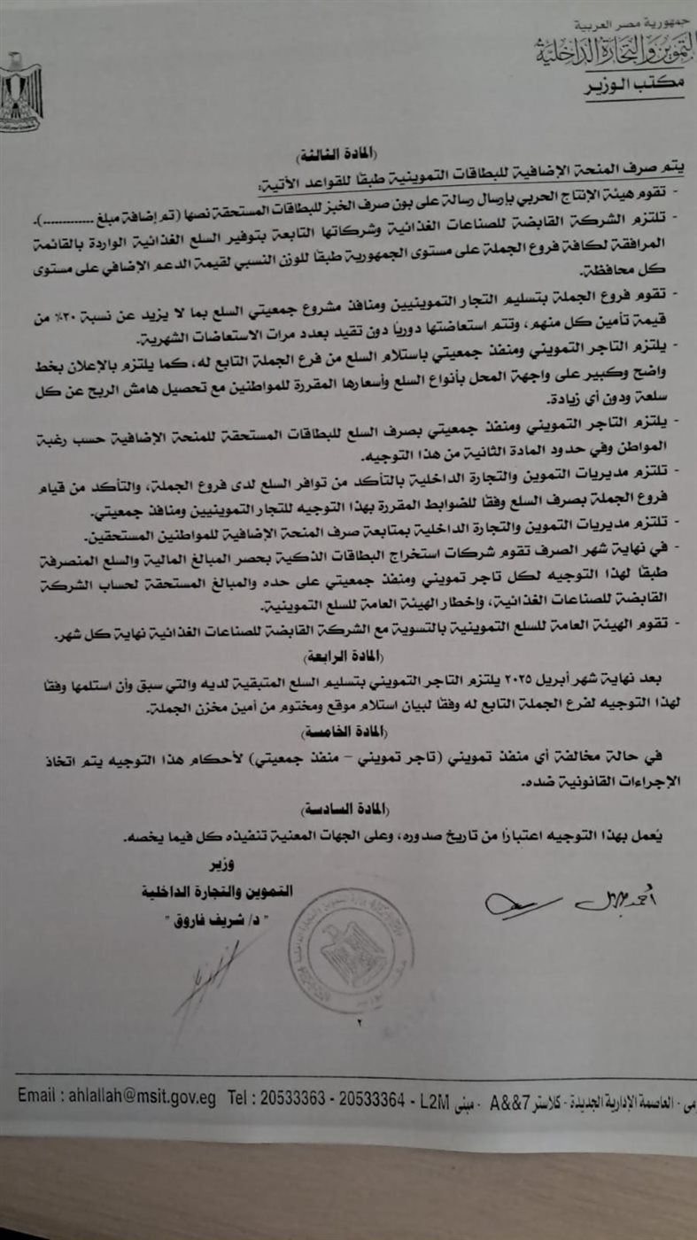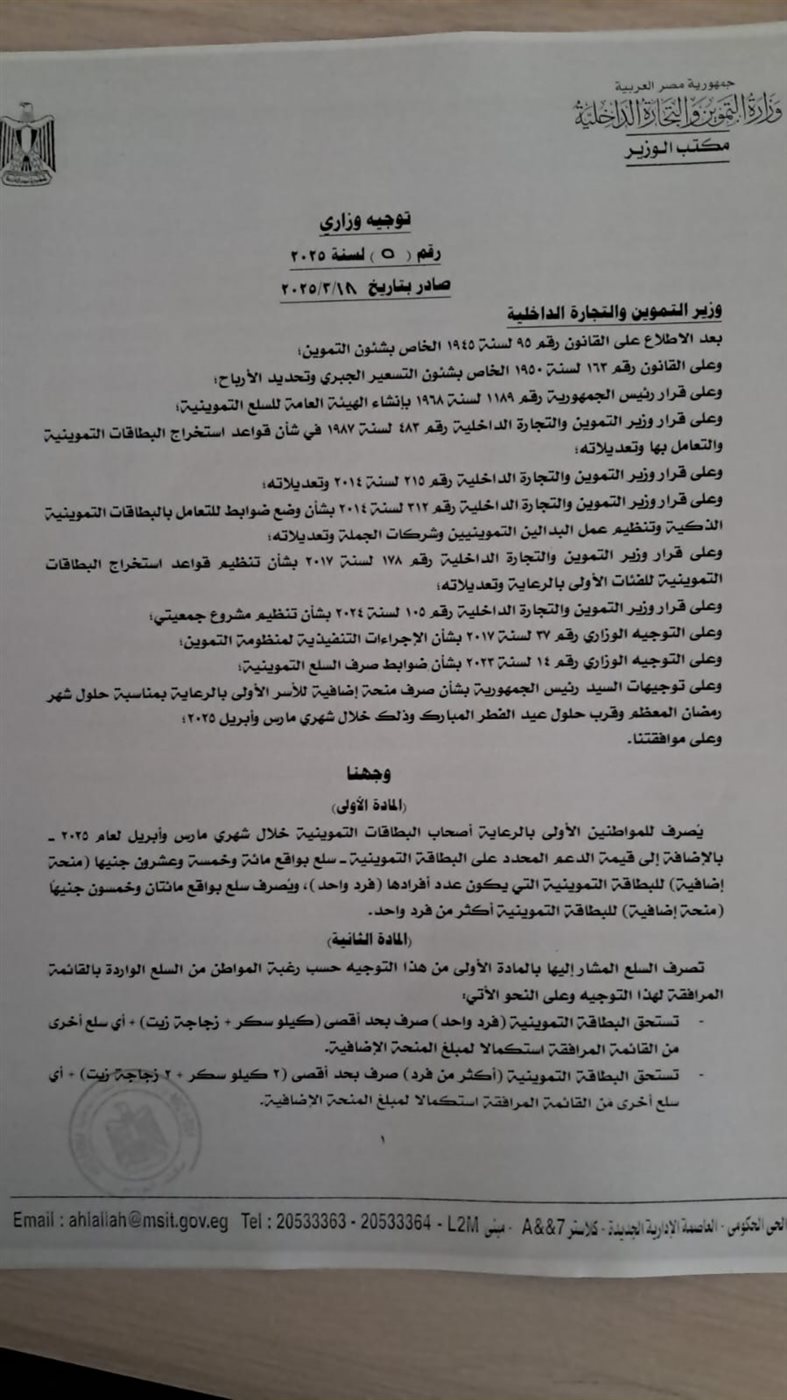 أصدر الدكتور شريف فاروق وزير التموين والتجارة الداخلية توجيهًا وزاريًا رقم (5) لسنة 2025، بشأن صرف المنحة الإضافية للمستفيدين من البطاقات التموينية خلال شهري مارس وأبريل، يأتي هذا التوجيه في إطار جهود الدولة لدعم الفئات المستحقة، خاصة مع قرب حلول شهر رمضان المبارك وعيد الفطر.