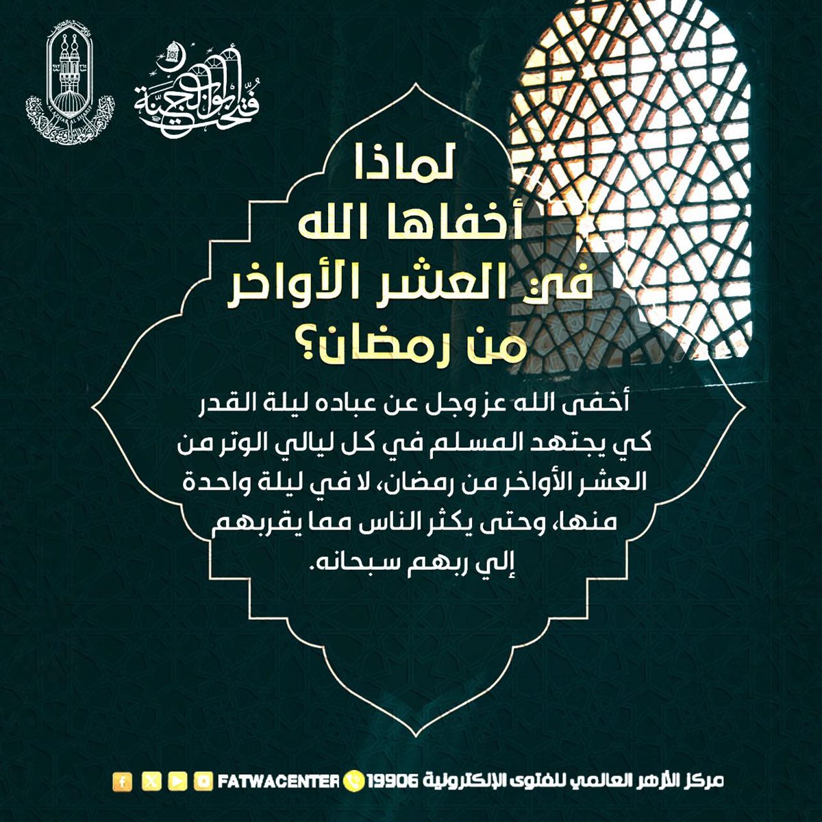 ذكر مركز الأزهر أن الله عز وجل أخفى ليلة القدر عن عباده حتى يجتهد المسلمون في العبادة والقيام والدعاء في جميع الليالي الوترية من العشر الأواخر من رمضان، وليس في ليلة واحدة فقط. وهذا الأمر يدفع المؤمنين إلى الإكثار من الأعمال الصالحة والتقرب إلى الله، مما يعود عليهم بالخيرات والبركات.