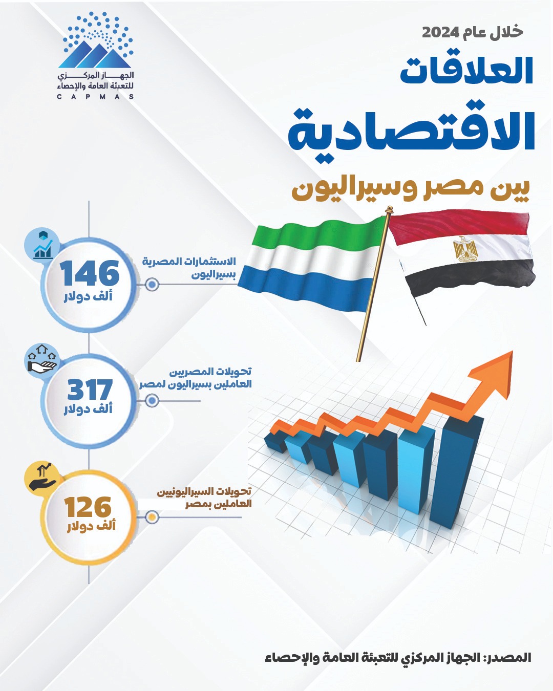 وحرصاً من الجهاز المركزى للتعبئة العامة والاحصاء على متابعة الزيارات والأنشطة الرسمية للسيد الرئيس وإصدار بيان صحفى يتضمن العلاقات الاقتصادية بين مصر وسيراليون فقد كشفت بيانات الجهاز اليوم الخميس الموافق 27/3/2025 عن وصول قيمة التبادل التجاري بين مصر وسيراليون إلى 37.6 مليون دولار خلال عام 2024 مقابل 57.9 مليـون دولار خلال عام 2023 .