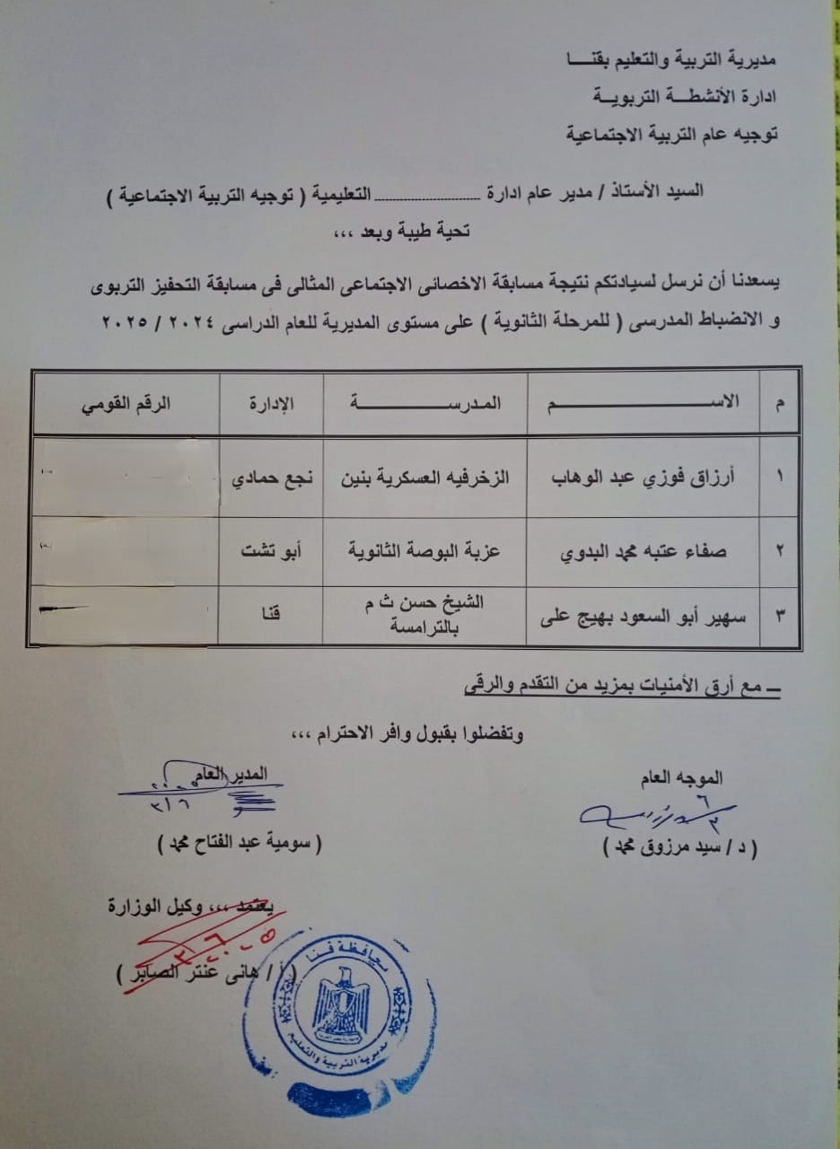 إعلان أسماء الاخصائي الاجتماعي المثالي في التحفيز التربوي بقنا