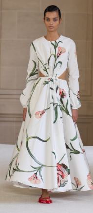 اختاري الفستان الأبيض المطبع بورود ضخمة ويتسم بتنورة ضخمة طويلة مع أكمام طويلة وهو من تصميم دار جيامباتيستا فالي Giambattista Valli، وانتعلي الصندل المسطح الأحمر بطابع موحد، ما يبرز التناقض الجاب بين اللونين الأحمر والأبيض. واختاري تسريحة شينيون مشدود إلى الوراء مع مكياج مينيمالي لكي تحافظي على رونق الإطلالة العصرية