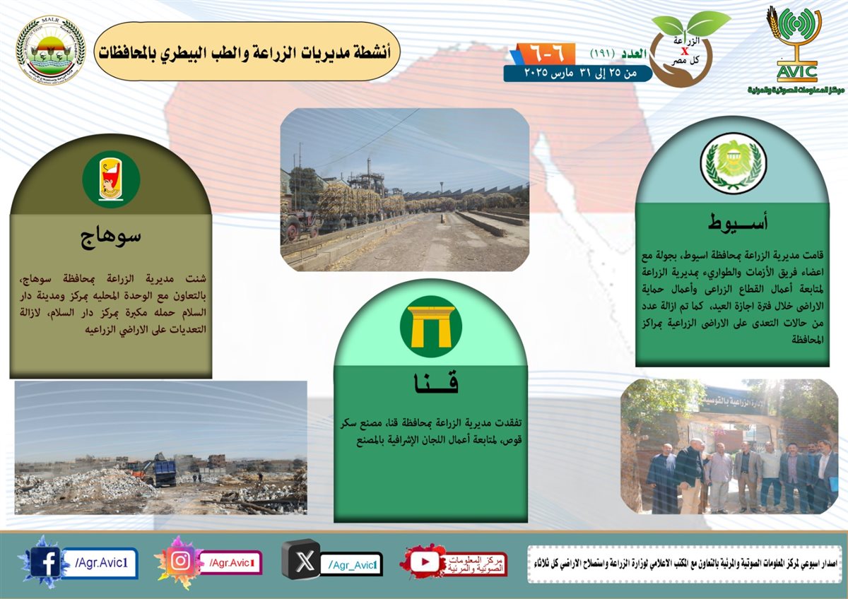 وخلال هذا الاسبوع ايضا شنت مديرية الزراعة بمحافظة سوهاج، بالتعاون مع الوحدة المحليه بمركز ومدينة دار السلام حمله مكبرة بمركز دار السلام، لازالة التعديات على الاراضي الزراعيه، تفقدت مديرية الزراعة بمحافظة قنا، مصنع سكر قوص، لمتابعة أعمال اللجان الإشرافية بالمصنع.