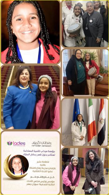 فاطمة بشير، البالغة من العمر 12 عامًا، هي طالبة وعضو مؤسس في اللجنة الثقافية بمؤسسة سيدتي Ladies، وعازفة إيقاع شرقي في وزارة الثقافة.