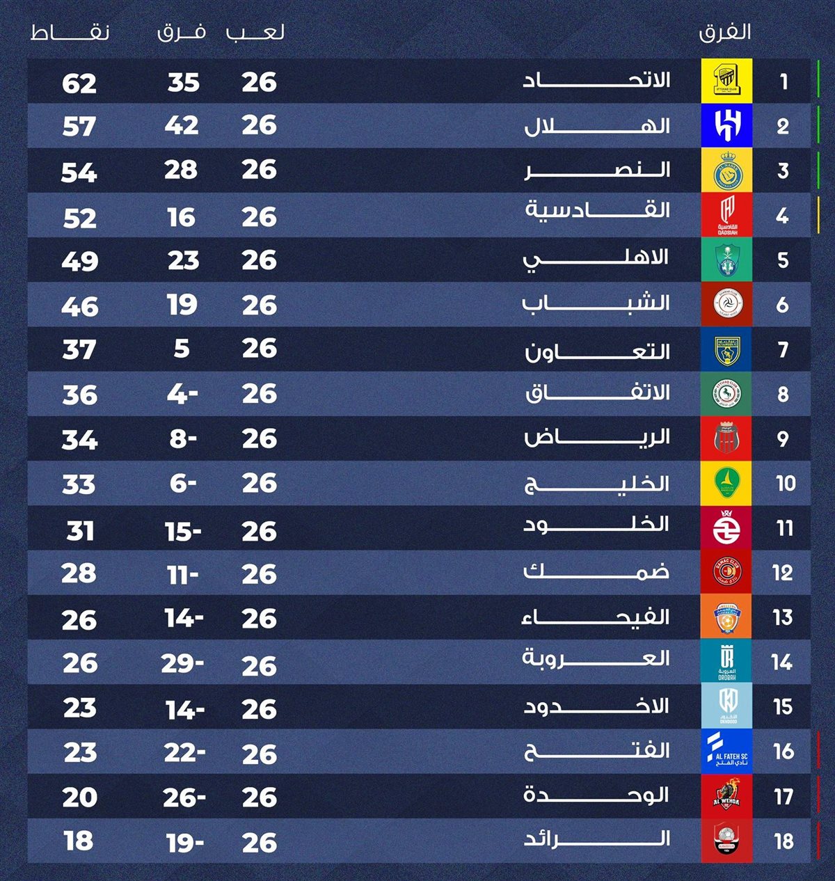 ويتربع فريق الاتحاد على صدارة جدول ترتيب الدوري برصيد 62 نقطة، بينما يحل الهلال وصيفًا بـ 57 نقطة، ثم يأتي النصر في المركز الثالث بـ 54 نقطة والقادسية رابعًا بـ 52 نقطة.