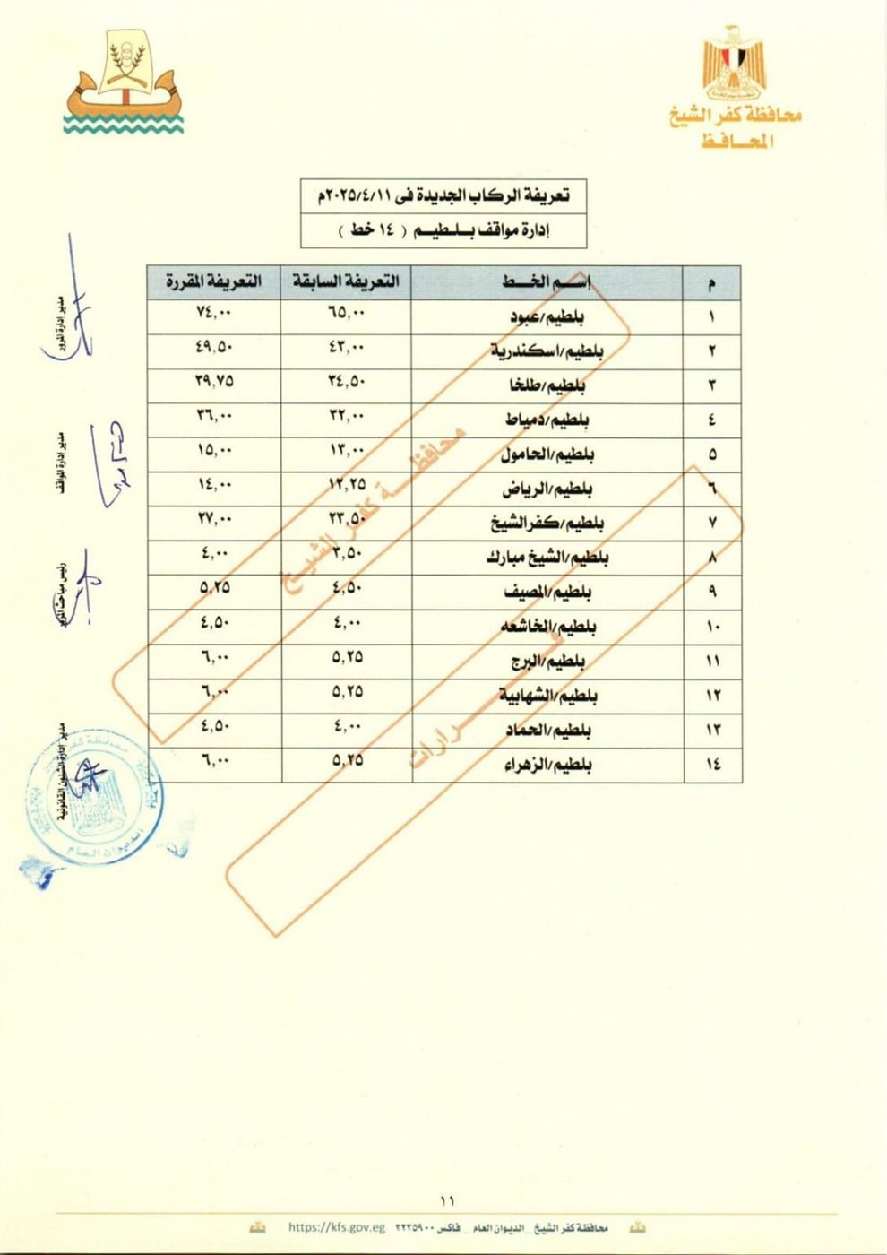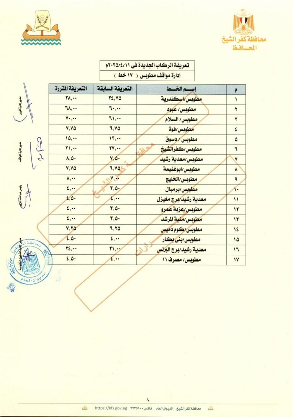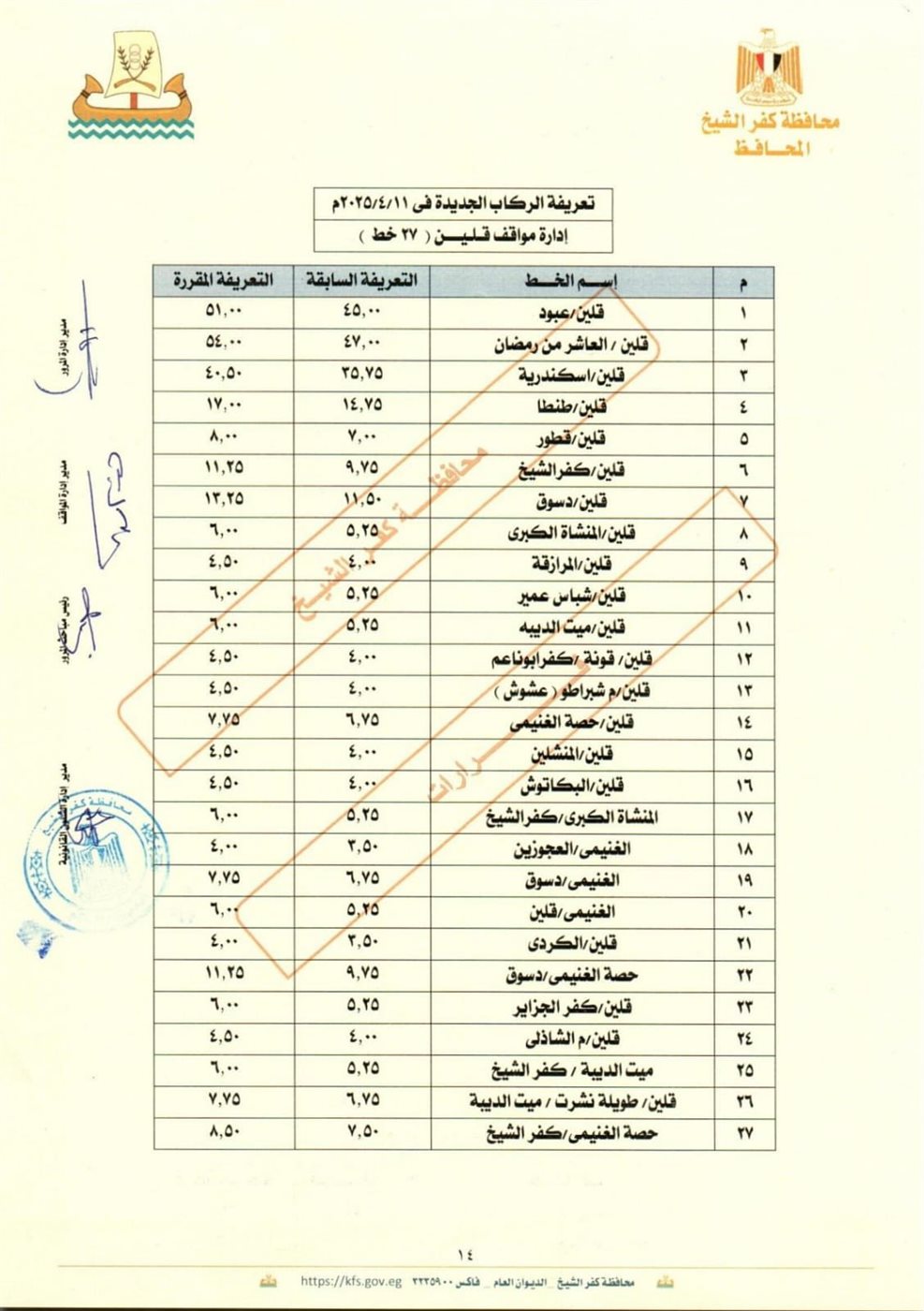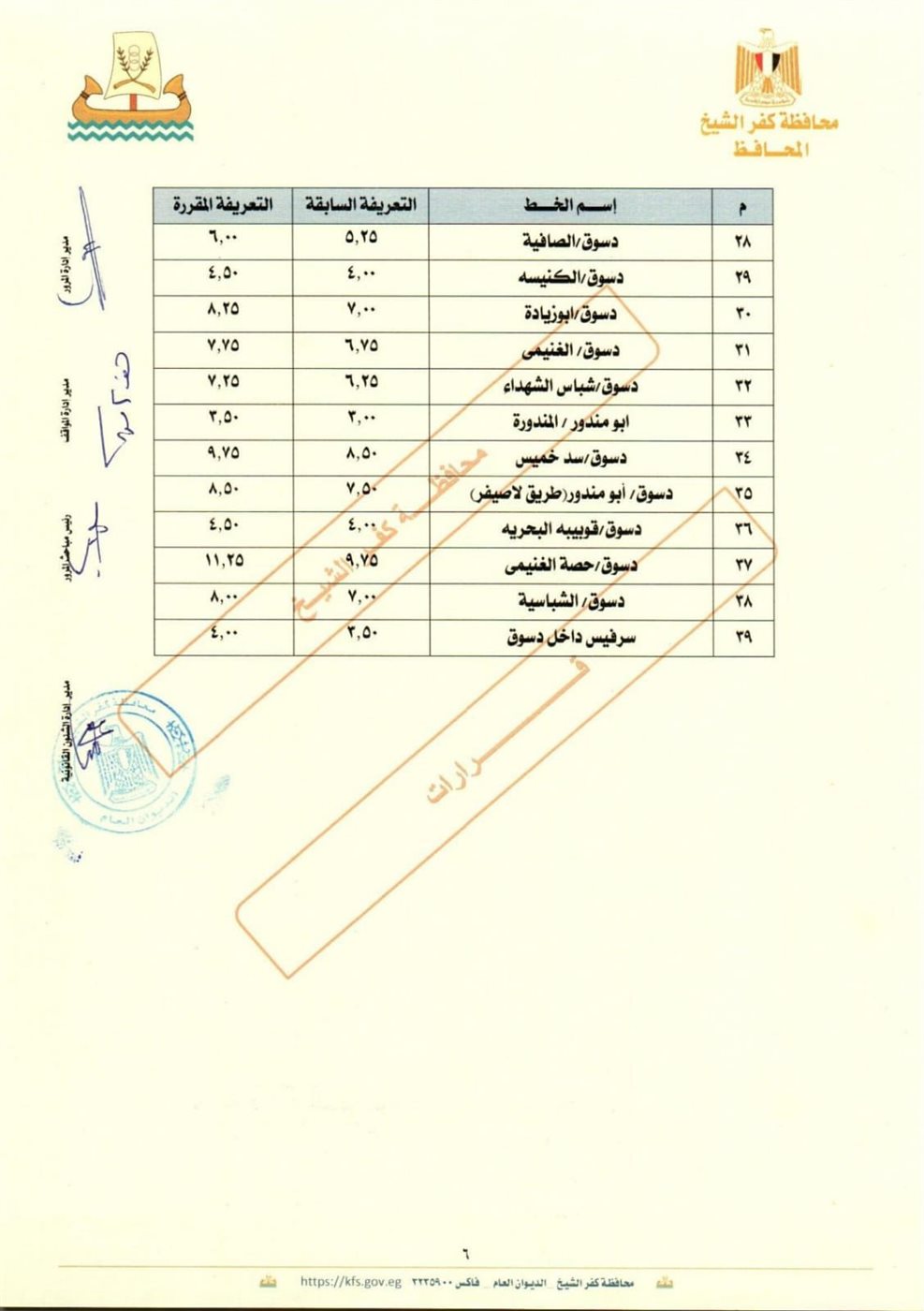 اعتمد محافظ كفر الشيخ اللواء دكتور علاء عبد المعطي، اليوم الجمعة، التعريفة الجديدة لنقل الركاب، على جميع المواصلات العامة والخطوط الداخلية والخارجية بنطاق المحافظة، بنسبة من 10 لـ 15%، عقب قرار لجنة التسعير التلقائي للمنتجات البترولية المعنية بوزارة البترول بتحريك أسعار المنتجات البترولية اعتباراً من اليوم الجمعة، محذرًا من استغلال المواطنين في تحصيل مبالغ أزيد من التعريفة المقررة.