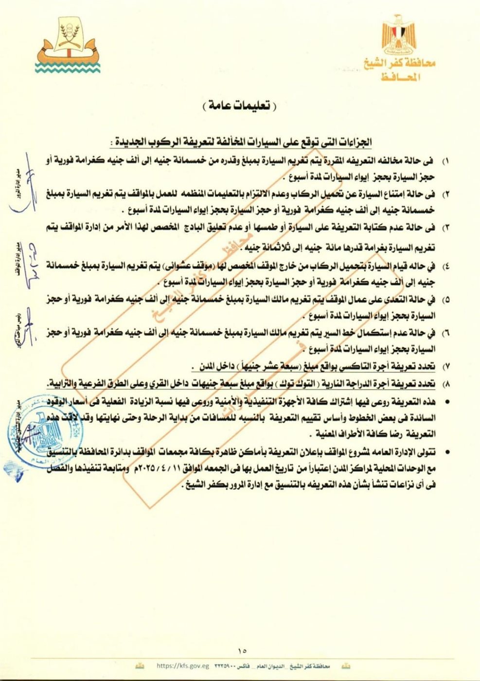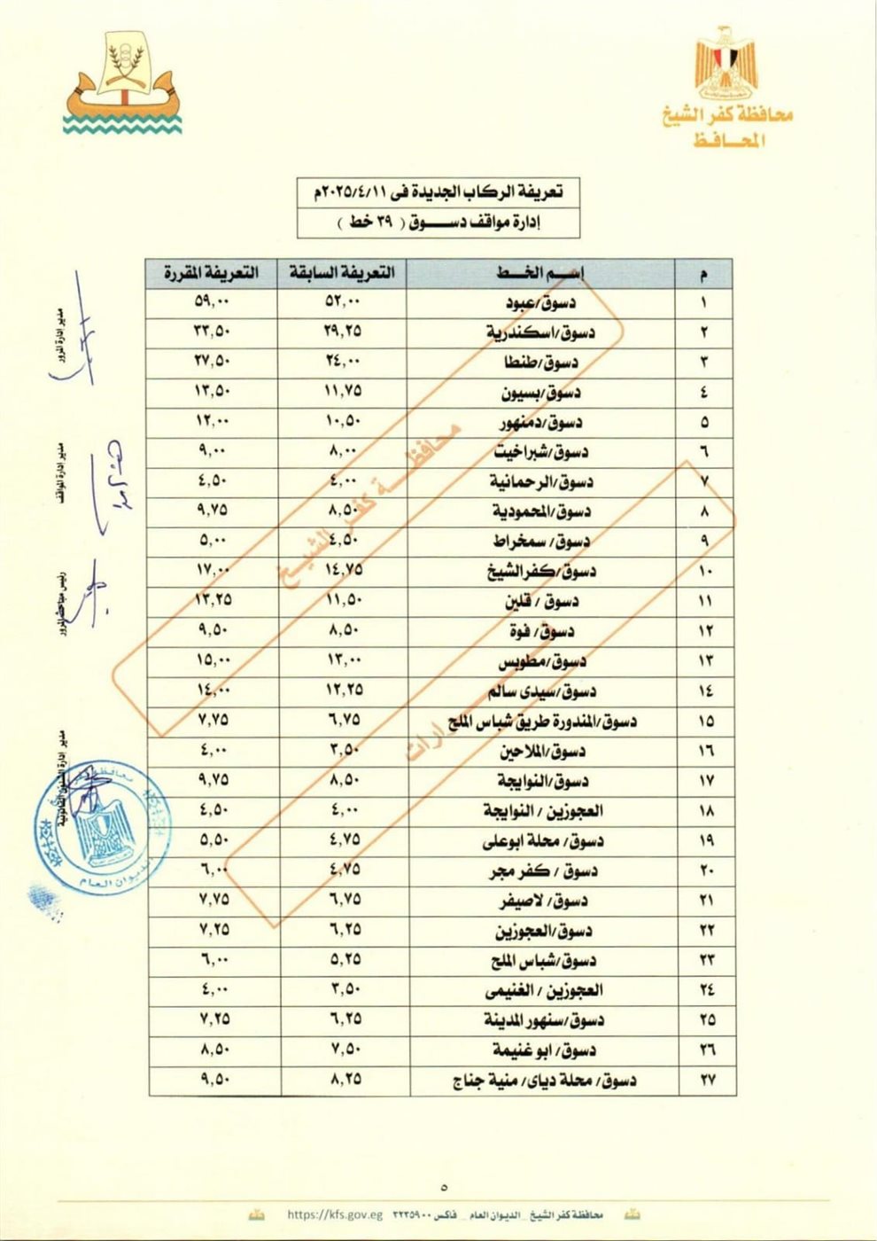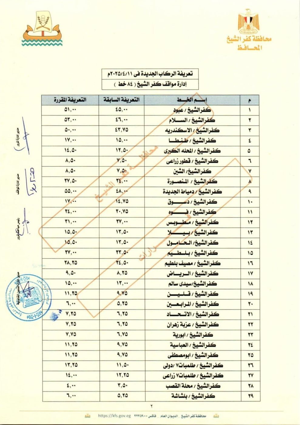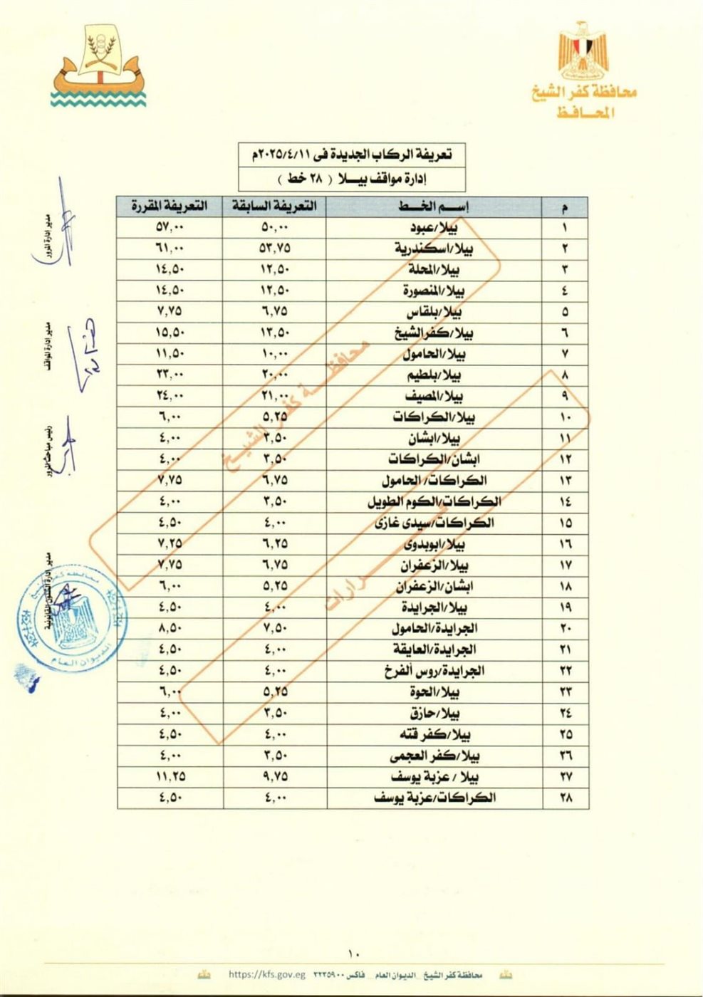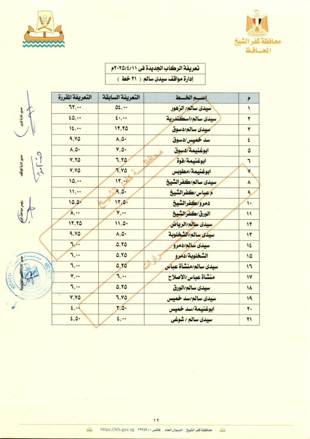 اعتمد محافظ كفر الشيخ اللواء دكتور علاء عبد المعطي، اليوم الجمعة، التعريفة الجديدة لنقل الركاب، على جميع المواصلات العامة والخطوط الداخلية والخارجية بنطاق المحافظة، بنسبة من 10 لـ 15%، عقب قرار لجنة التسعير التلقائي للمنتجات البترولية المعنية بوزارة البترول بتحريك أسعار المنتجات البترولية اعتباراً من اليوم الجمعة، محذرًا من استغلال المواطنين في تحصيل مبالغ أزيد من التعريفة المقررة.