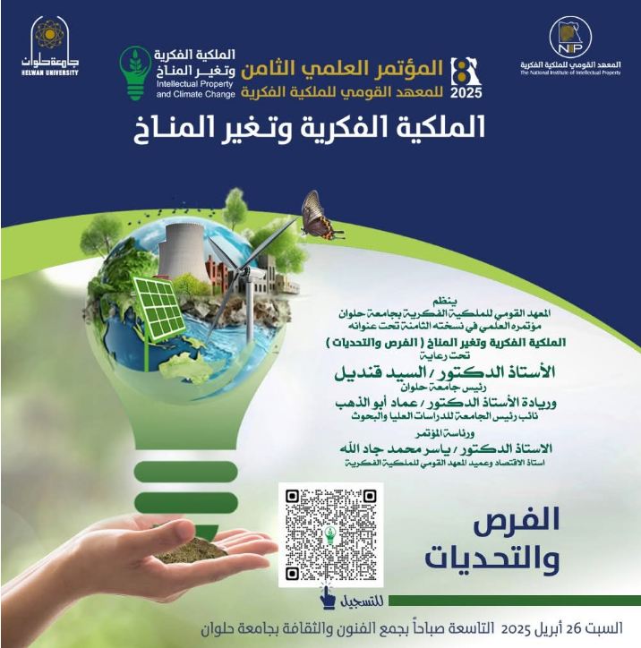 ينظم المعهد القومى للملكية الفكرية بجامعة حلوان المؤتمر العلمى الثامن تحت عنوان " الملكية الفكرية وتغير المناخ : الفرص والتحديات" يوم السبت ٢٦ أبريل الجارى.