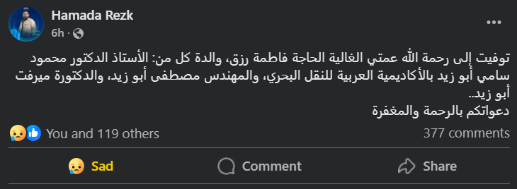وكتب أحمد رزق: "توفيت إلى رحمة الله عمتي الغالية الحاجة فاطمة رزق، والدة كل من: الدكتور محمود سامي أبو زيد بالأكاديمية العربية للنقل البحري، والمهندس مصطفى أبو زيد، والدكتورة ميرفت أبو زيد"، مختتمًا منشوره بطلب الدعاء لها بقوله: "دعواتكم بالرحمة والمغفرة".