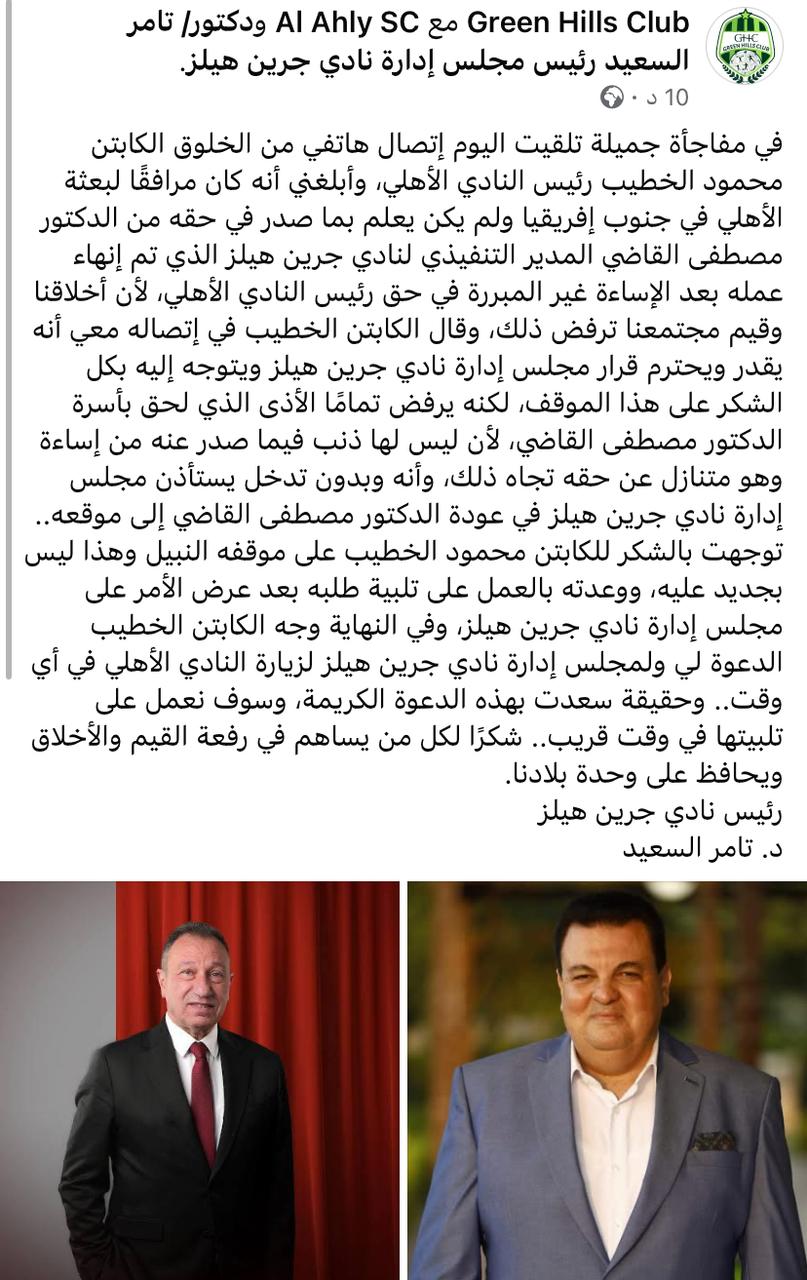 أصدر نادي جرين هيلز بيانًا بشأن موقف المدير التنفيذي للنادي وما ورد منه من في حق محمود الخطيب رئيس مجلس النادي الاهلي، وأكد تامر السعيد رئيس نادي جرين هيلز على حسب وصفه البيان  أنه تلقى اتصالاً هاتفياً من الخلوق الكابتن محمود الخطيب رئيس النادي الأهلي.