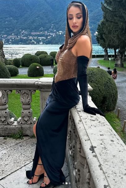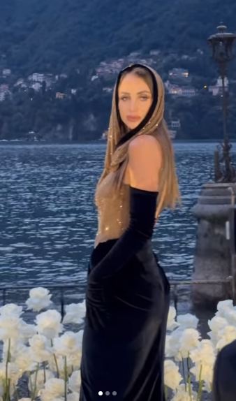 وبدت أنابيلا بإطلالة عصرية تمزج بين الأثارة والأنوثة في آن واحد، حيث ارتدت فستانًا طويلًا مجسمًا، ينتمي لقصة الكب، صمم الفستان من قماش المخمل باللونين الذهبي مع الأسود وتميز الفستان بشق مثير كشف عن أحد ساقيها، الفستان عكس قوامها الرشيق فيما انتعلت حذاءً بكعب عالٍ.