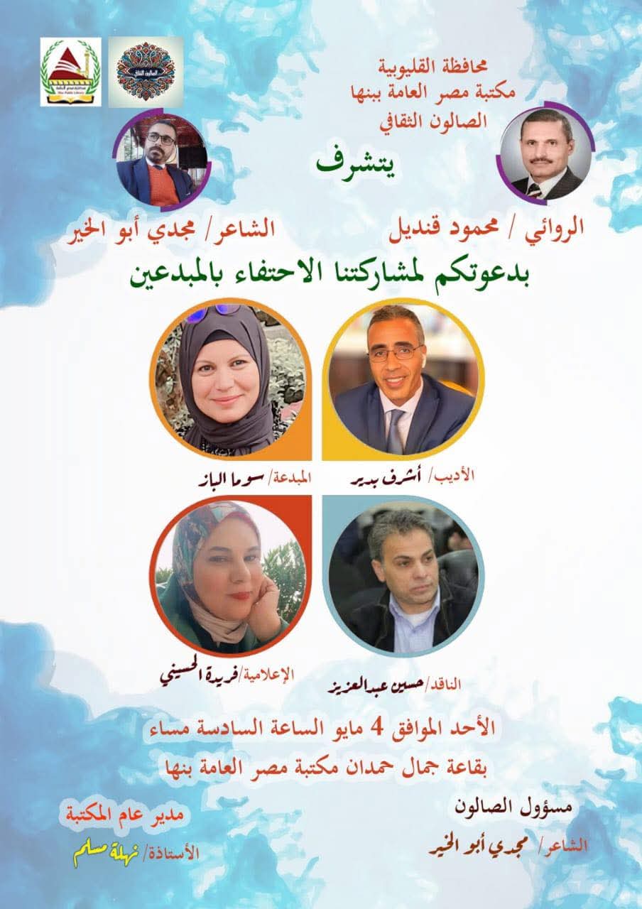 ينظم الصالون الثقافي بمكتبة مصر العامة ببنها، ندوة للاحتفاء بمجموعة من مبدعي محافظة الدقهلية، وذلك في السادسة مساء غد الأحد، الموافق ٤ مايو، بقاعة جمال حمدان بمقر المكتبة ببنها.