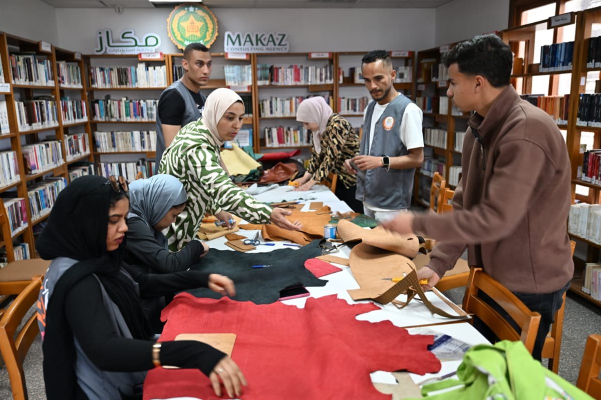 وورشة "المشغولات الجلدية" بقيادة نسرين مجدي، التي بدأت بالتعرف على أنواع الجلود وأدوات الحياكة اليدوية.